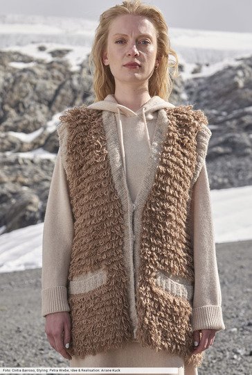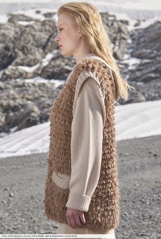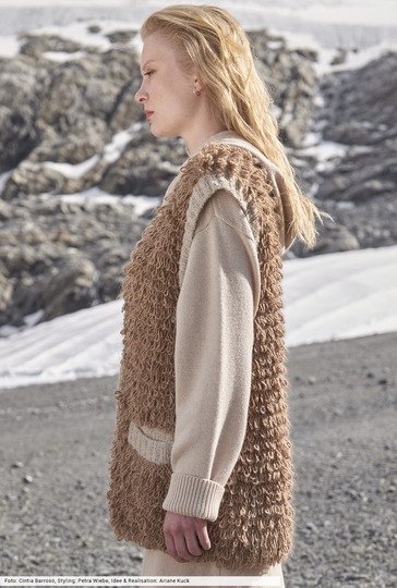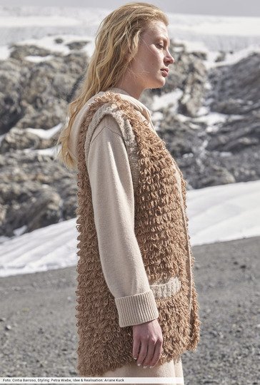 Wer kein Fake-Fur-Garn zur Hand hat, macht sich den Fell-Effekt einfach selber. Mit einem gestrickten Schlingenmuster, bei dem Sie den Alpaka-Faden zweimal um den Finger legen müssen, danach wird die Masche rechts abgestrickt. Schmale Blenden aus Bouclé-Wolle, eingearbeitete Taschen und "unsichtbare" Druckknöpfe runden den Après-Ski-Look perfekt ab und lassen eine Longweste entstehen, die du zu allen winterlichen Outfits kombinieren kannst.