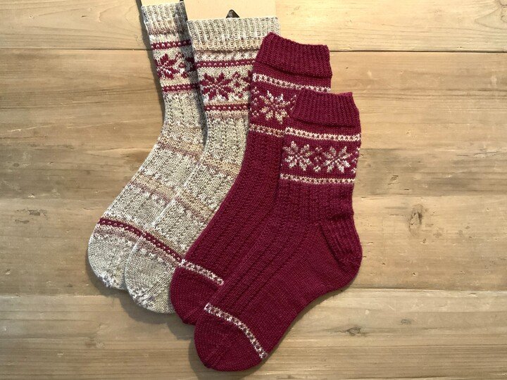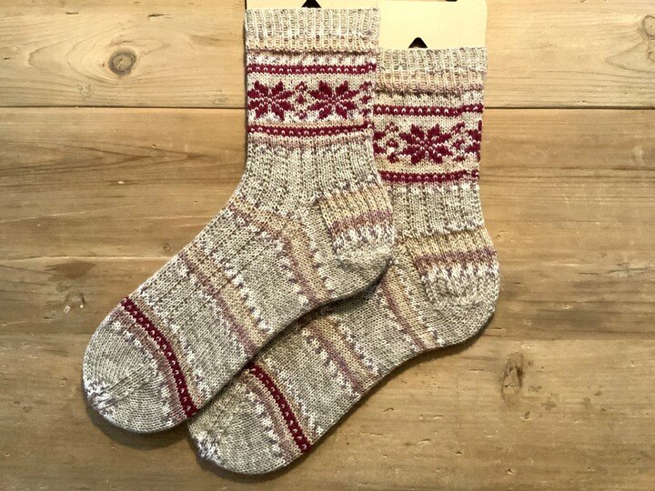 „Donia“, sind Socken mit einem klassischen winterlichen Fair-Isle-Muster, das durch ein einfaches Rippenmuster ergänzt wird. Aus einem Knäul unifarbener und einem Knäul musterbildender Sockenwolle (jeweils 100 g) kann man 2 Paar Socken stricken, ein Paar mit einem uni-Hintergrund, das andere Paar hat den musterbildenden Hintergrund. Ich habe die Ferse als Herzchenferse (mit Doppel-maschen) mit verstärkter Fersen-wand gearbeitet und eine Band-spitze gestrickt und beschrieben. Ferse und Spitze können jedoch auch anders ausgeführt werden. Die Anleitung enthält Angabe für die Größen 36 bis 47, lässt sich aber ganz einfach auch für andere Größen abwandeln, da das Rippen-muster einen Rapport von 4 Maschen umfasst.