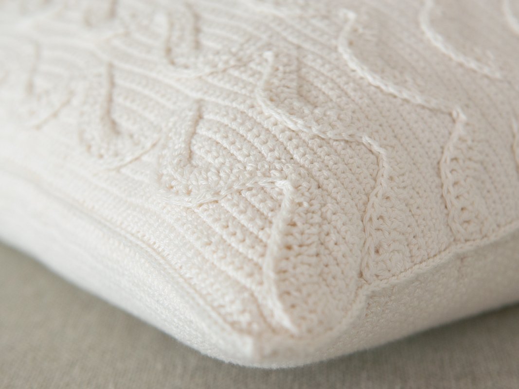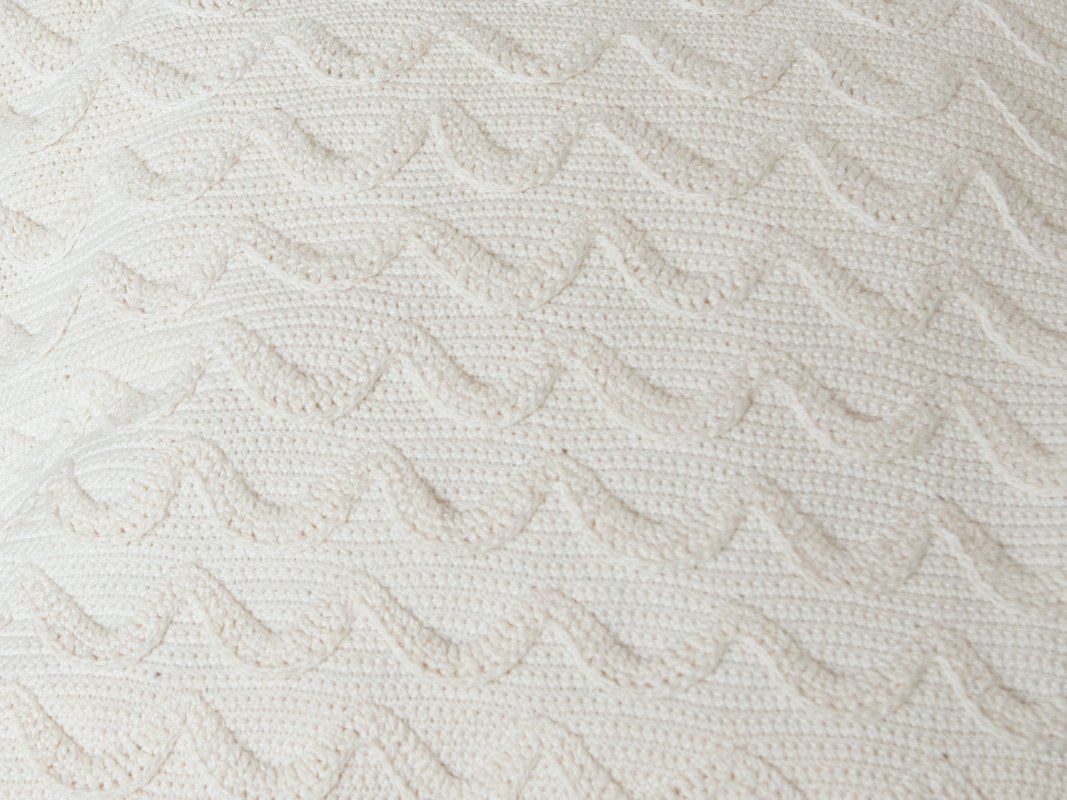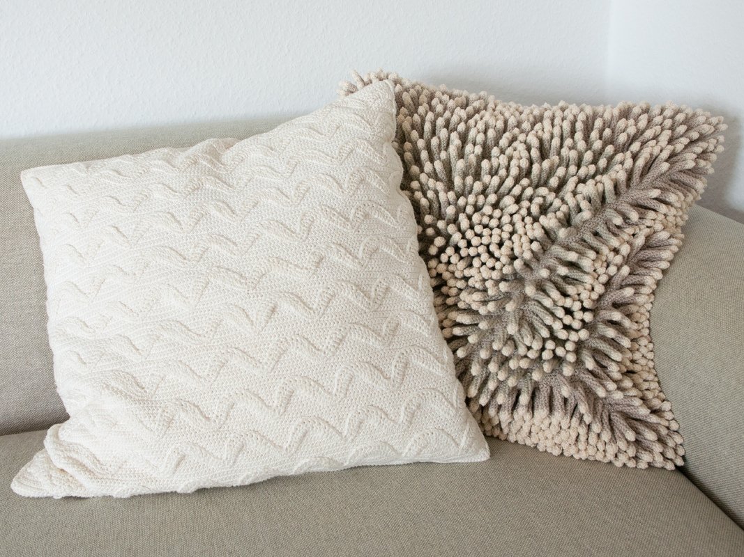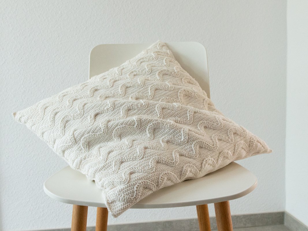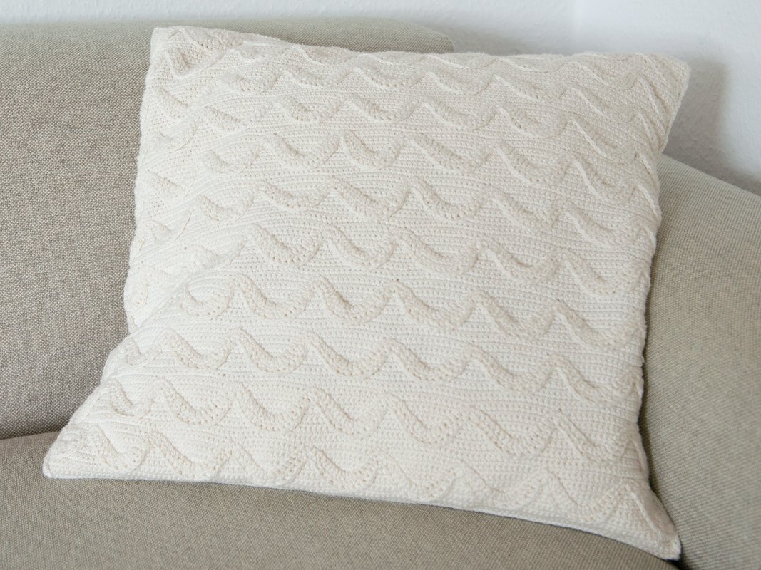 Zuerst wird der Kissenbezug in zwei Teilen (Vorder- und Rückseite) gehäkelt. Das Wellenmuster wird dann auf den Kissenbezug gestickt, gehäkelt und genäht. Dann wird der Reißverschluss integriert. Zum Schluss werden Vorder- und Rückseite zusammengehäkelt.