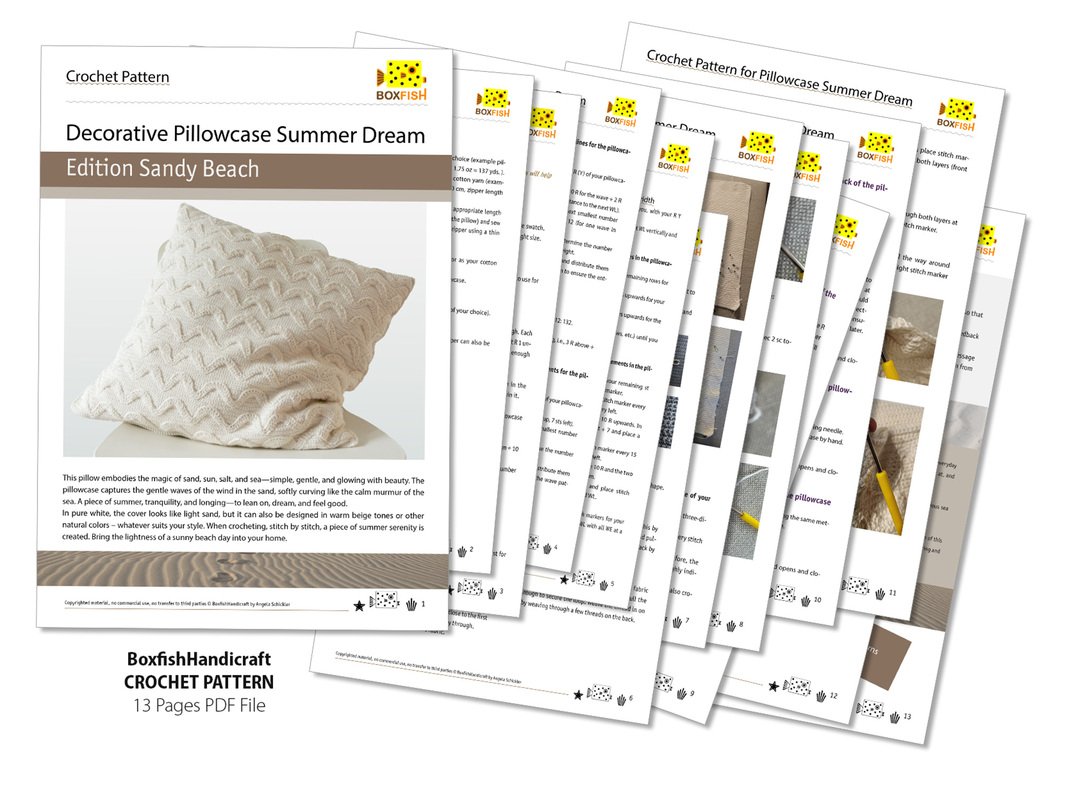 BoxfishHandicraft Häkelanleitung für das Dekokissen Sommertraum Edition "Sandstrand" in der Größe deiner Wahl (PDF-Datei / 13 Seiten).