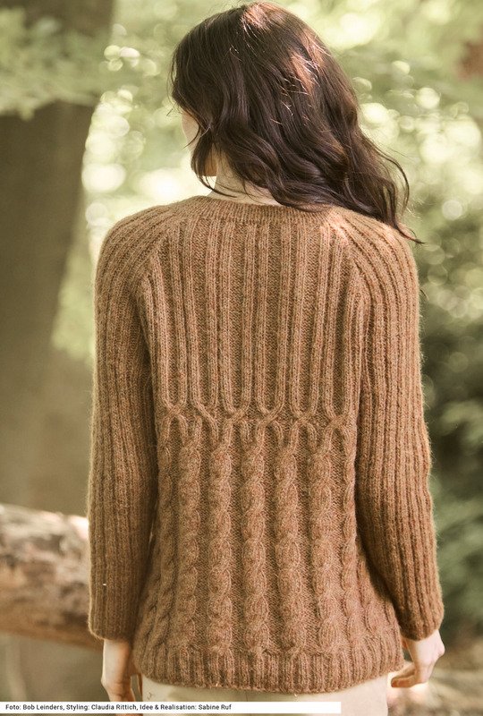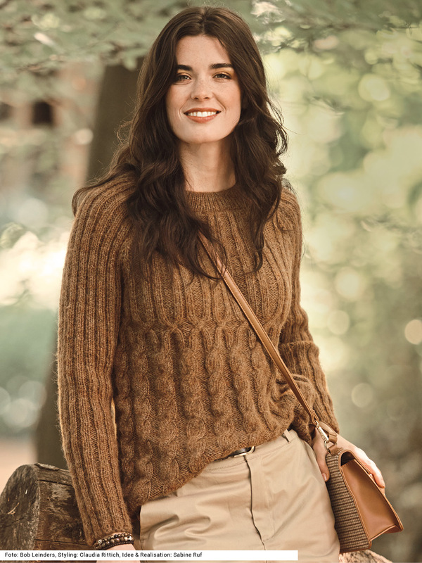 Hier gehen Rippen und Zöpfe auf ideale Weise ineinander über; bevor im Passenbereich die Rippen entstehen, werden die Zöpfe diagonal weitergeleitet. Die Ärmel sind ganz im 2/2-Rippenmuster gestrickt. Besonders anschmiegsam ist auch der Kragen im Doppelstrick. Das Garn vereint recycelte Baumwolle und recyceltes Polyester (PET) mit edlen Naturfasern wie Baby-Alpaka und extrafeiner Merinowolle. Diese besondere Mischung sorgt für einen flauschigen, zarten Griff, hervorragende Wärmeeigenschaften und ein nachhaltiges Strickerlebnis mit Stil. Obendrein kann der Pulli im Wollwaschgang in der Waschmaschine gewaschen werden. Die Anleitung dazu gibts für die Größen 38/40, 42/44 und 46/48.
