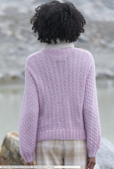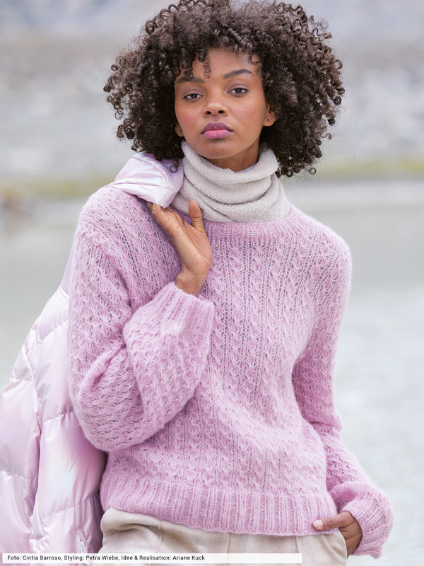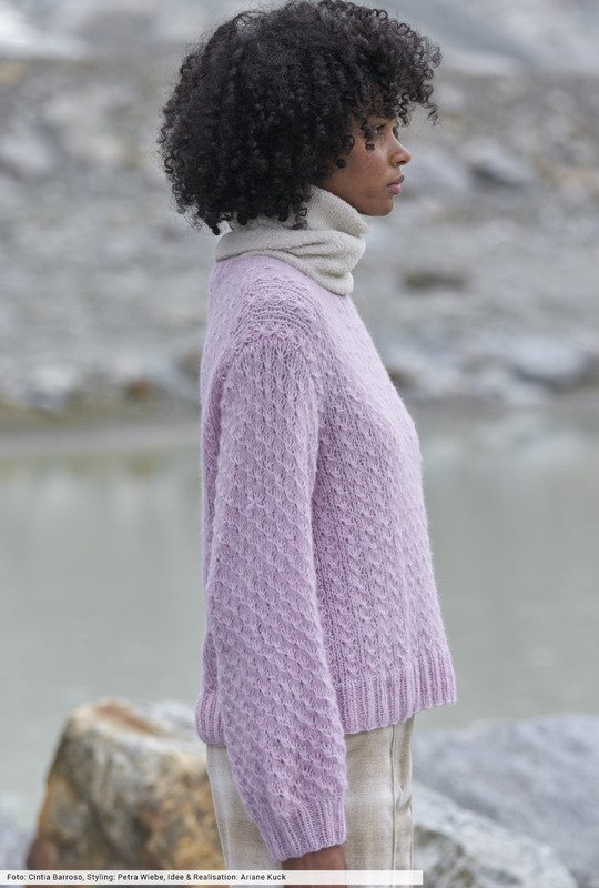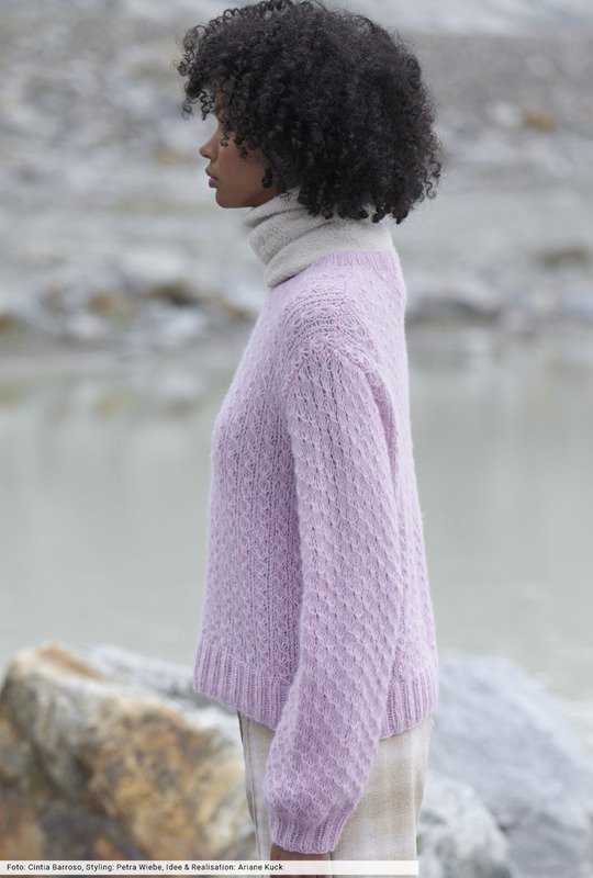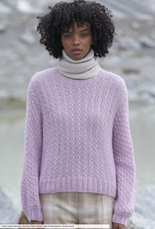 Ein feines Mohair-Seidengarn mit einem Hauch von Yak-Fasern bildet bei diesem locker fallenden Pulli die Grundlage. Wir haben es doppelt in zwei unterschiedlichen Pastell-Nuancen verstrickt. Die Strukturmuster unterscheiden sich erst auf den zweiten Blick: Bei Vorder- und Rückenteil liegen die überzogenen Maschen etwas weiter auseinander als bei den Ärmeln. Das klassische Finish bilden elastische Blenden aus rechten und linken Maschen.