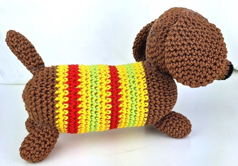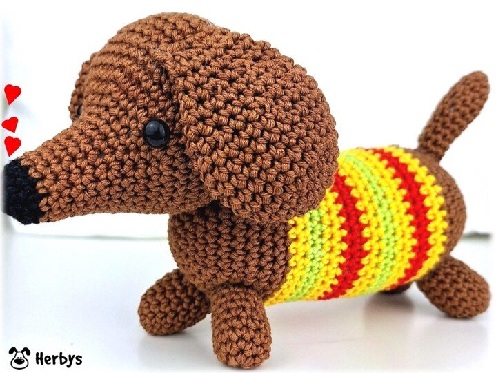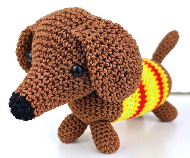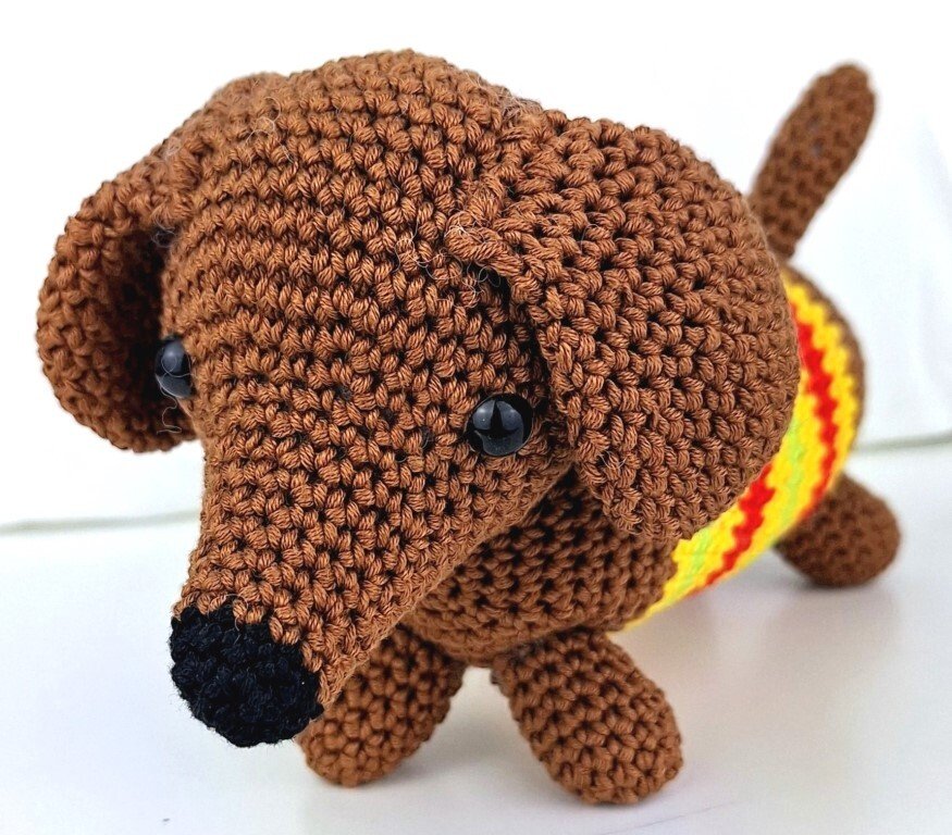 Der kleine Dackel ist aus reiner Baumwolle gehäkelt und sicher auch in anderen Farben lustig.