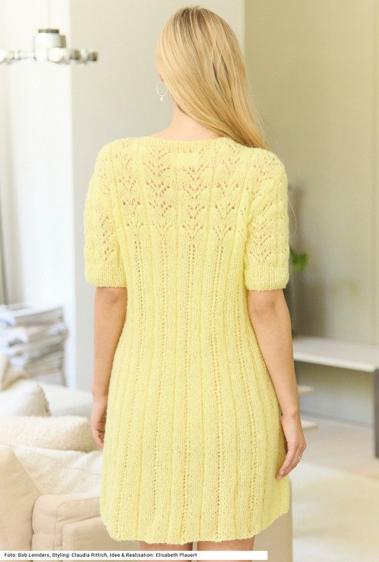 Dieses Strickkleid mit kurzen Ärmeln mit seinem kunstvollen Mix aus Loch- und Rippenmuster ist federleicht und umschmeichelt den Körper ganz zart. Das liegt am langlaufenden Garn aus Wolle, Mohair, Polyacryl, Polyamid und Kamelhaar. Die sanfte A-Linie des rund, also ohne Naht, gestrickten Kleids sorgt für eine feminine Silhouette. Im unteren Teil gibt es ein breites Rippenmuster mit Lochlinien dazwischen, im Passenbereich dann ein Ajourmuster. Die Ärmelbündchen und die Blende am runden Halsausschnitt werden im 1/1-Rippenmuster gearbeitet. Die Anleitung dazu gibts für die Größen 36/38, 40/42 und 44/46.