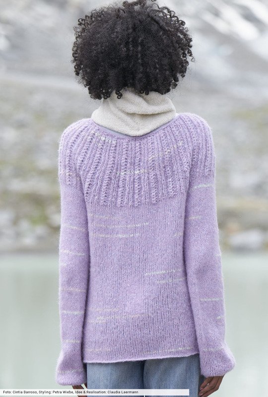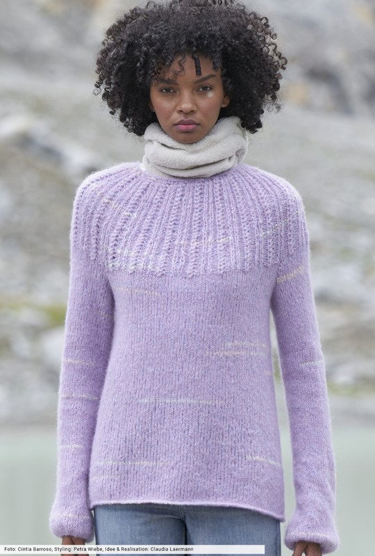 Rundgestrickt und ganz ohne Nähte – so macht die Masche besonders viel Spaß. Wir beginnen mit Vorder- und Rückenteil, danach werden die Ärmel fertiggestellt. Alles mit rechten Maschen, so kommen wir schnell voran und das weiche Flauschgarn kann die eingewobenen, hellen Farbstreifen voll und ganz zur Geltung bringen. Für die Rundpasse alle Teile zusammenfügen und das Strukturmuster arbeiten. Der Pulli endet mit einer schmalen ICord-Blende.