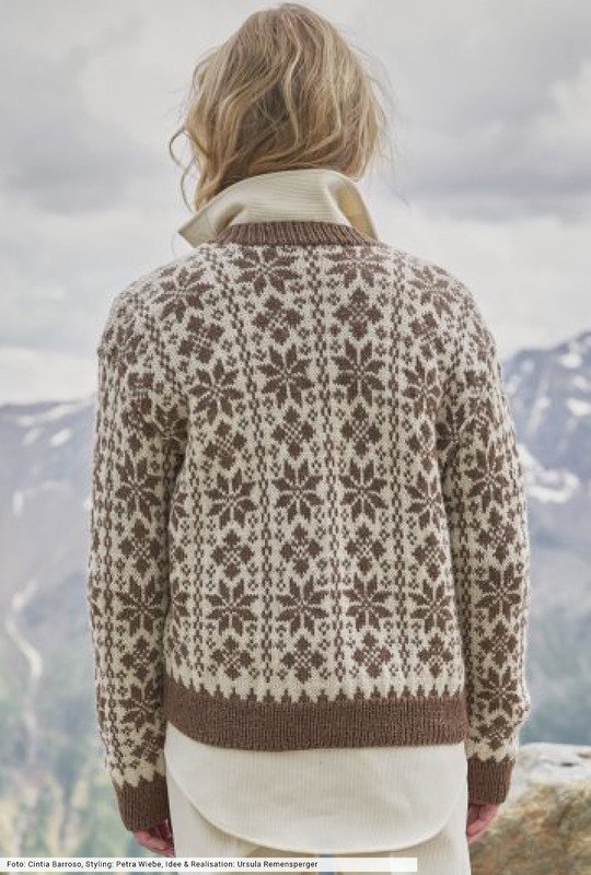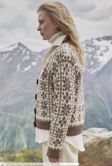 Schurwolle und Baby Lama lassen hier zu gleichen Teilen ein hochwertiges Garn entstehen, das sich in ruhiger Farbhamonie präsentiert. Die hübschen Eissterne ziehen sich allover über die Jacke und werden nach einem Zählmuster glatt rechts gearbeitet. Dafür musst du den unbenutzten Faden locker auf der Rückseite der Arbeit mitführen. Schmale Blenden in Rippenoptik geben den klassischen Touch, während die extravaganten Knöpfe als modischer Blickfang dienen.
