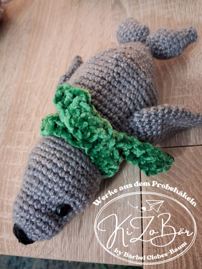 Bedenkt bitte, dass die größe Materialabhängig ist. Meine Probehäklerinnen haben ihn teiweise mit Chenille gehäkelt, dann wird er fast 40 cm lang und wirklich knuddelig für Kinder.