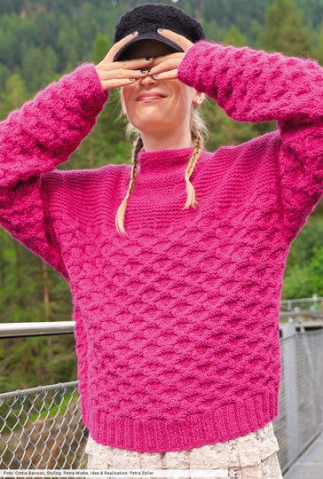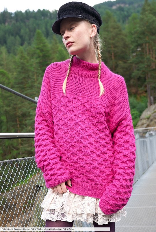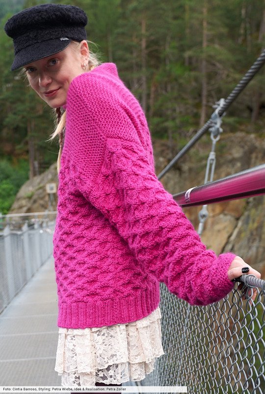 Der Winter darf laut sein, zumindest was die Wahl deiner Lieblingsfarbe angeht. Hier ist es ein intensiver Pinkton, dessen dicke Lamawolle nicht nur das Wabenmuster toll zur Geltung bringt, sondern auch Wohlgefühl und Tragekomfort vermittelt. Die breite Kraus-rechts-Blende mustert den oberen Teil des Pullis und endet übergangslos in einen hohen Stehkragen. So macht die Masche Spaß – und das auch an trüben Nebeltagen.
