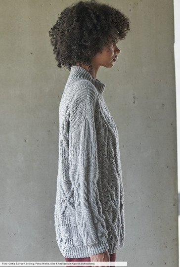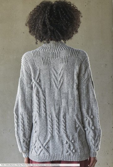 Die extravagante Patchworkoptik dieses wunderschönen Pullis sucht ihresgleichen. Denn nicht nur Zöpfe und Rippen kommen zum Einsatz, auch Rautenmotive und Noppen ziehen die Aufmerksamkeit auf sich. Und aúfmerksam muss man auch beim Stricken sein, denn der stete Musterwechsel erfordert etwas Geduld und Know-how. Dafür kannst du deine Herbstgarderobe mit einem Highlight schmücken, das es nicht von der Stange zu kaufen gibt.