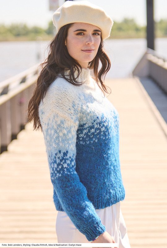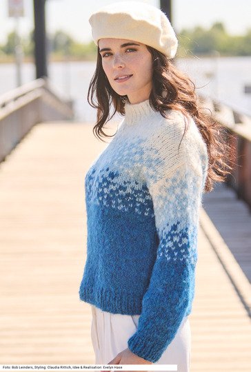 Einem Schneegestöber gleich entwickelt sich das Jacquardmuster von dunkel nach hell. Dieser klassische, gerade geschnittene und leicht flauschige Pulli erzeugt eine herrliche Winter-Anmutung. Dazu passt das weiche Garn aus Alpaka, Schurwolle und Baumwolle. Gerade eingesetzte Ärmel erleichtern das Einnähen und lassen die Schultern lässig überfallen. Hauptsächlich glatt rechts gearbeitet, werden die Bündchen und der Stehkragen jedoch im 1/1-Rippenmuster in der jeweils passenden Farbe gestrickt. Eine Anleitung kann für die Größen 36/38, 42/44 und 48/50 downgeloadet werden.