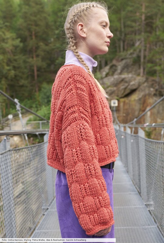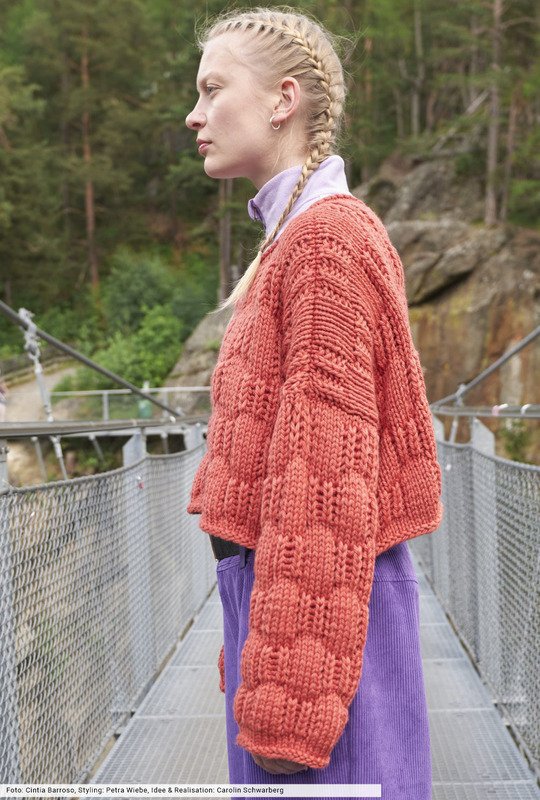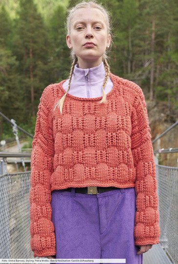 Voller Power präsentiert sich dieser tomatenrote Kurzpulli, dessen plakatives Karomuster durch das griffige Wollgarn zusätzlich akzentuiert wird und fast dreidimensional zur Geltiung kommt. Wir haben dafür Reihe für Reihe eine genaue Beschreibung erstellt, bei der sich Glatt-rechts-Maschen mit Patentrippen abwechseln. Ein toller Effekt, an den sich auch Anfängerinnen wagen können. Das Finish bilden schmale Blenden, bei denen lediglich eine Rückr rechte Maschen zum Einsatz kommt.