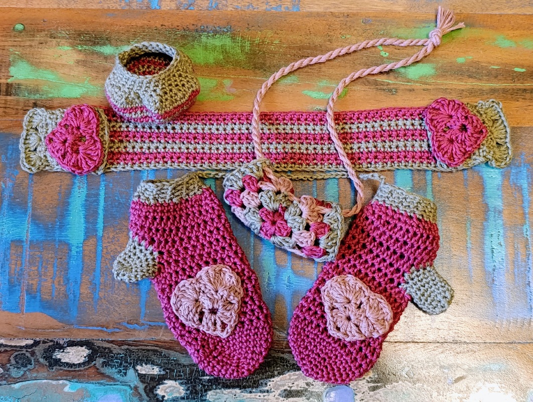 Eine Baskenmütze, ein Taschenschal mit zwei Taschen, ein Muff und ein Paar Fäustlinge gehören zum Set.