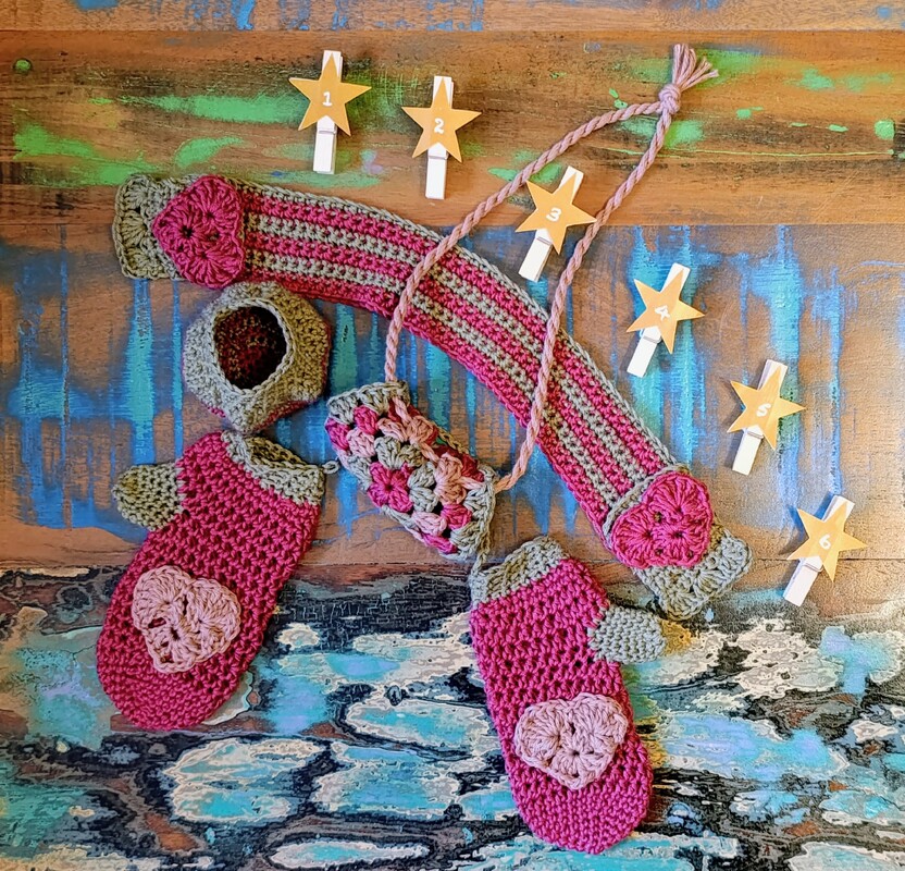 Das Sortiment besteht aus sechs „Türchen“, um einen kompletten Kalender zu erhalten, wird jedes Teil 4x gehäkelt.