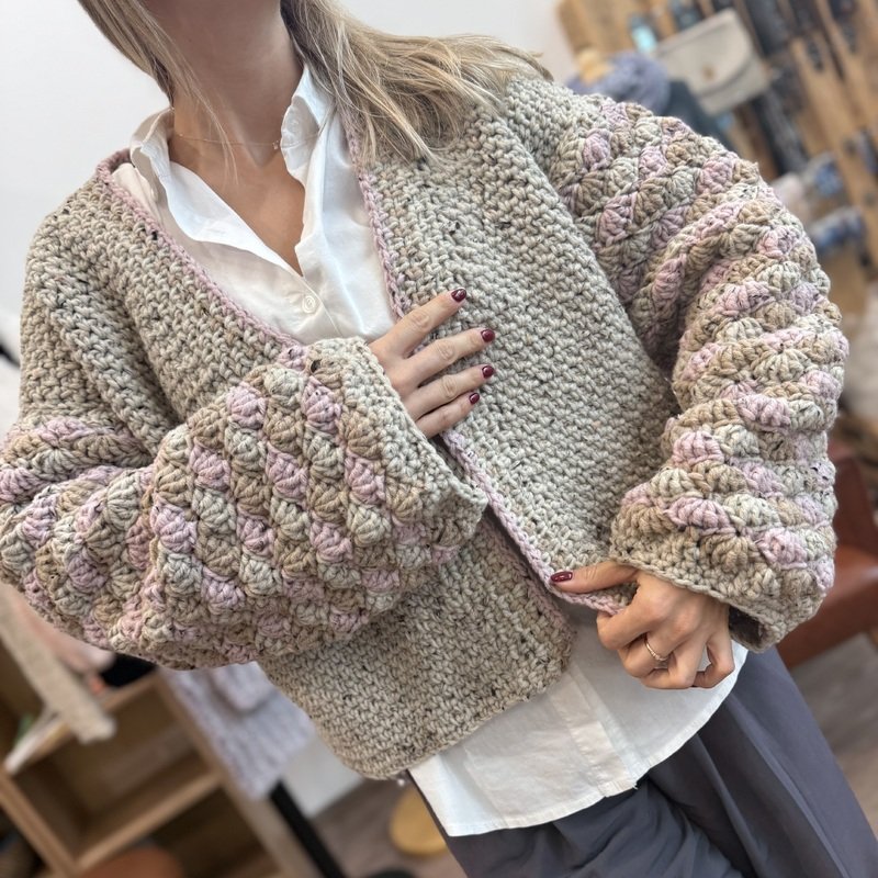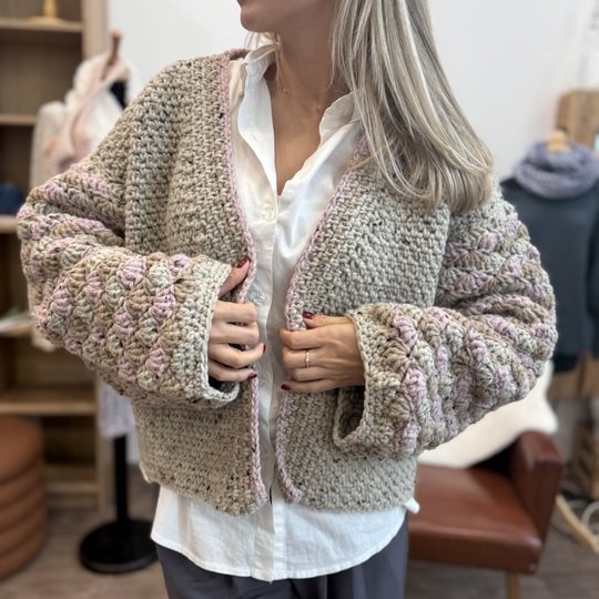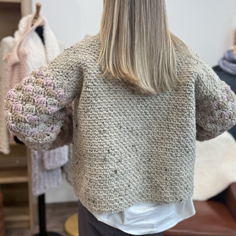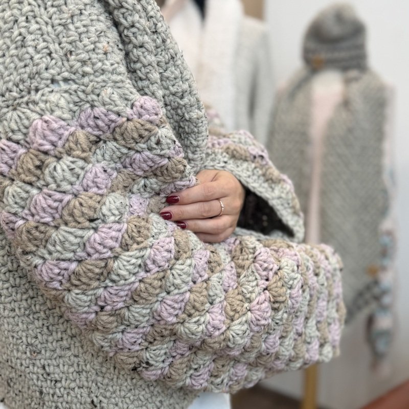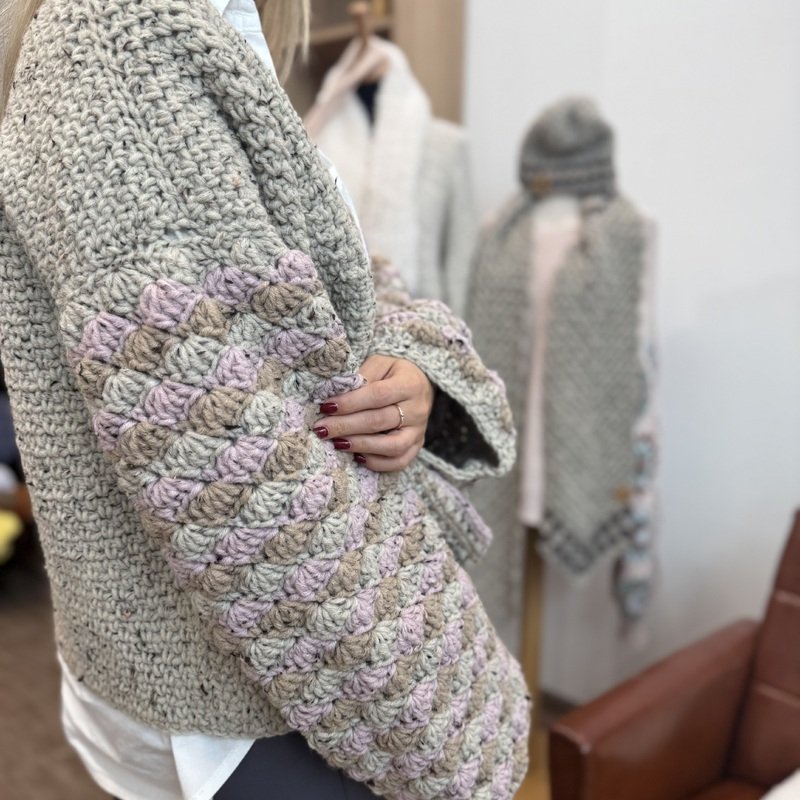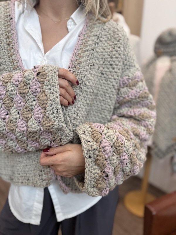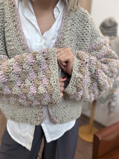 Diese wunderschöne Jacke ist ein echtes Unikat und ein Must-have für alle, die sanfte Farben, gemütliche Materialien und handgemachte Mode lieben. Die zarten Pastelltöne und das Muster an den Ärmeln verleihen der Jacke einen Vintage-Charme. Die Jacke ist nicht nur kuschelig und angenehm zu tragen, sondern auch ein absoluter Hingucker. Ob lässig zur Jeans oder elegant über einem Kleid – sie verleiht jedem Outfit das gewisse Etwas.