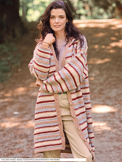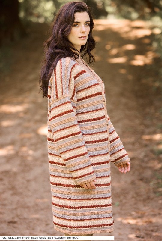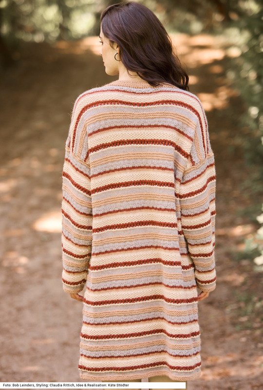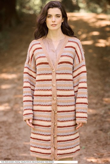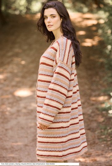 Es ist interessant, was man mit einfachen Mustern aus rechten und linken Maschen, die sehr strukturiert in wechselnden Farben daherkommen, machen kann. Es beginnt am Saumrand mit kraus rechts, dann folgen in unterschiedlichen Breiten glatt rechts, Lochmuster, kleines Perlmuster und Schachbrettmuster. Dieser oversized geschnittene Mantel mit V-Ausschnitt aus kuscheligem Alpaka-Garn sorgt für eine luxuriöse Haptik und angenehme Wärme. Abgerundet wird er mit eleganten Knöpfen an der kraus rechts gearbeiteten Blende. Eine Anleitung dazu gibt es für die Größen 38/40, 42/44 und 46/48.