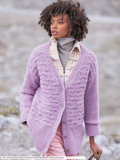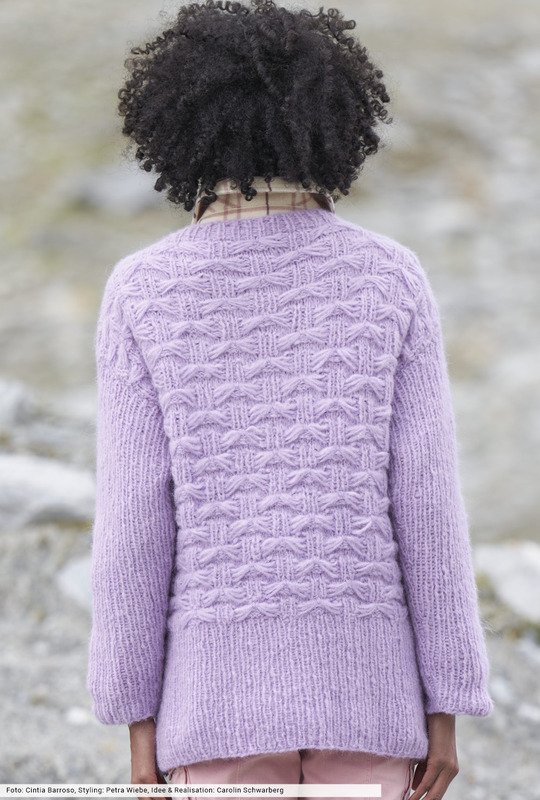 Bei diesem Fangmuster raten wir zu einer kleinen Maschenprobe, danach geht die Arbeit umso schneller von der Nadel. Denn für die tolle Optik müssen erst Spannfäden gearbeitet, vor der Arbeit entlanggeführt und dann zusammen verstrickt werden. Aber keine Angst: Unsere übersichtliche Strickschrift dient als Orientierungshilfe. Die hohen Bündchen und die schmalen Ärmel stricken sich dann im einfachen Rippenmuster wie von selbst. Aus edlem Lamagarn ein Stück fürs Leben!
