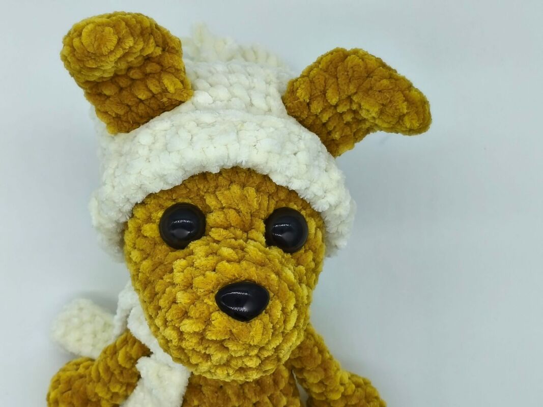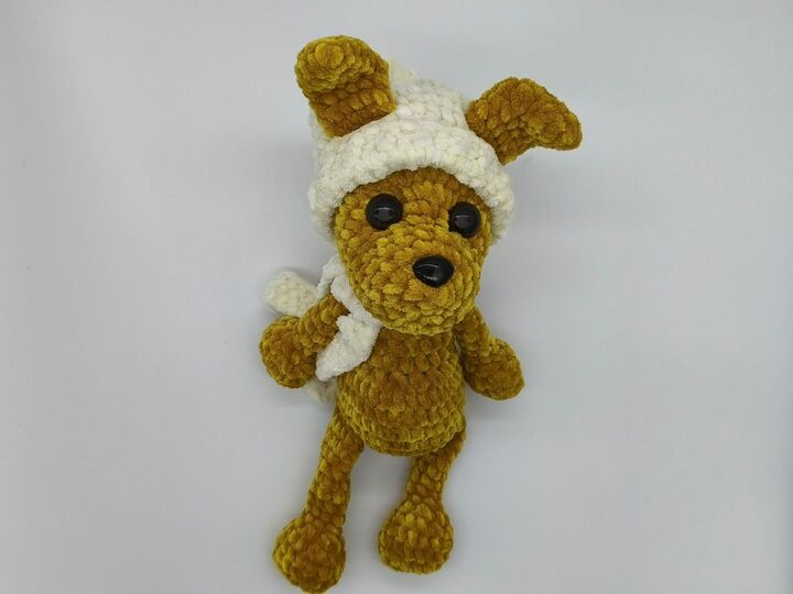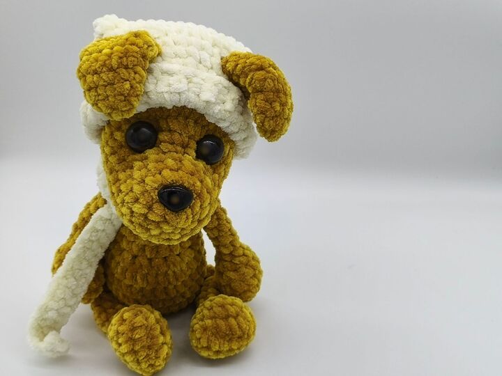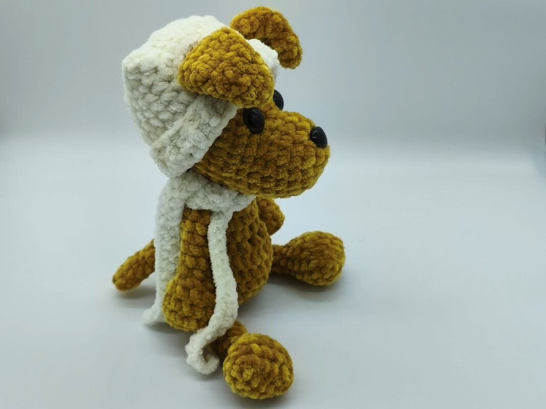 Mit Mütze und Schal kann dieser kleine, gehäkelte Hund