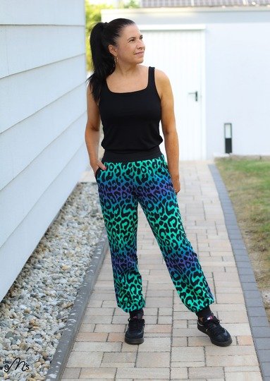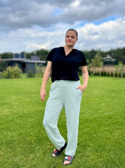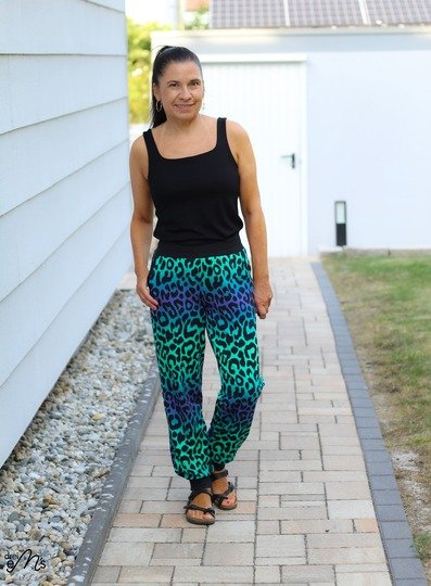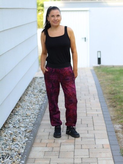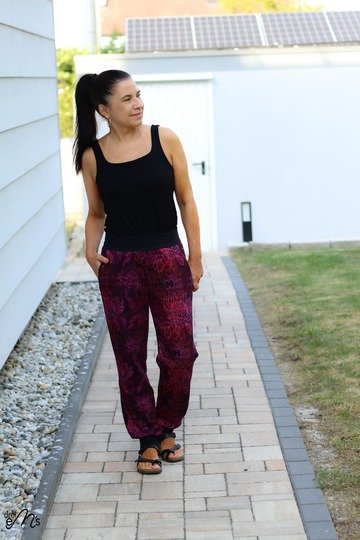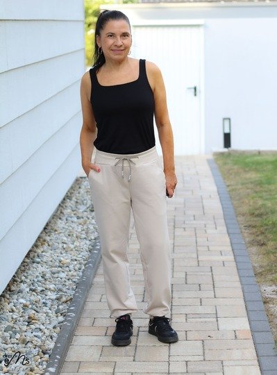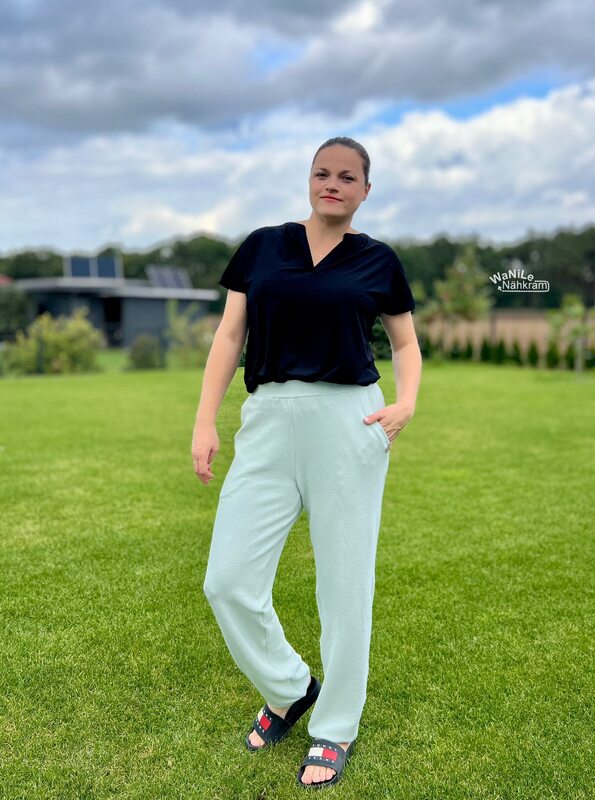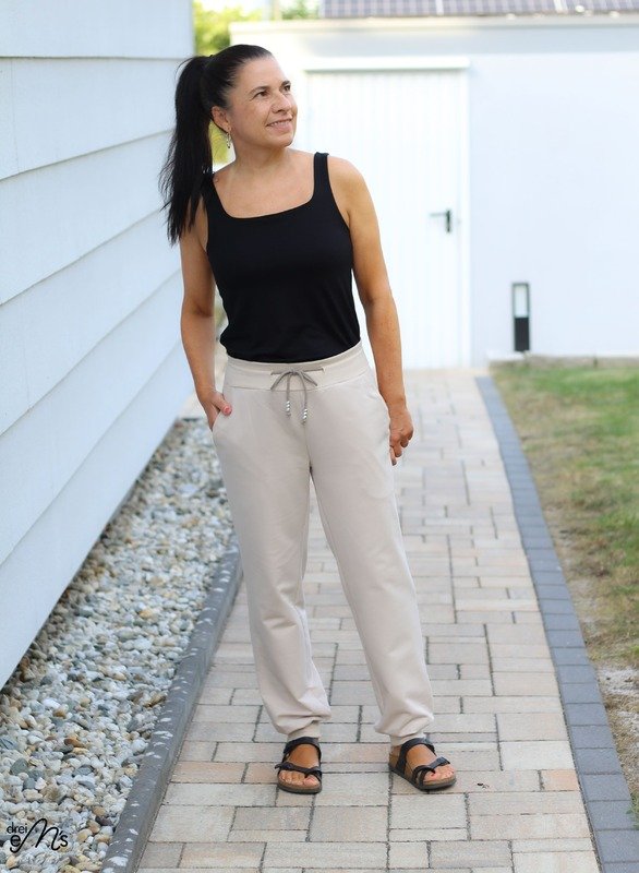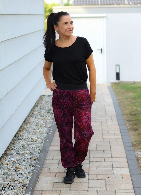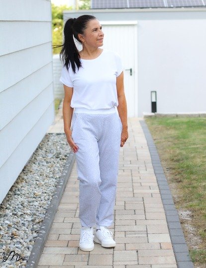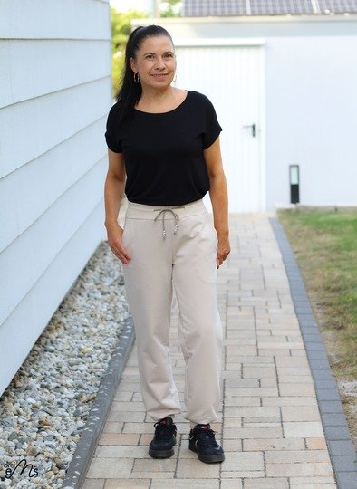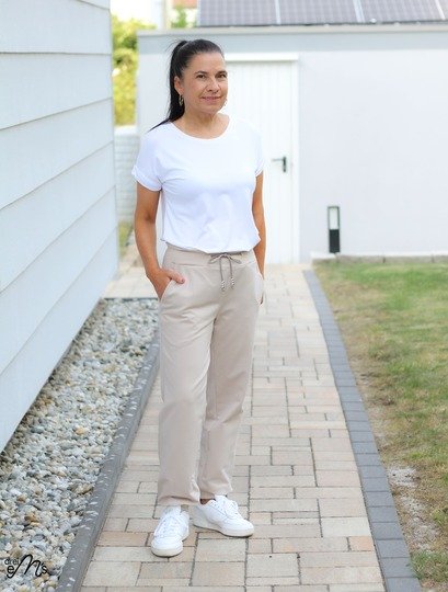 Falls du keinen Bündchenabschluss möchtest und lieber eine gerade geschnittene Hose nähst, empfehle ich dir das Schnittmuster MOENA – perfekt für einen cleanen, klassischen Stil.