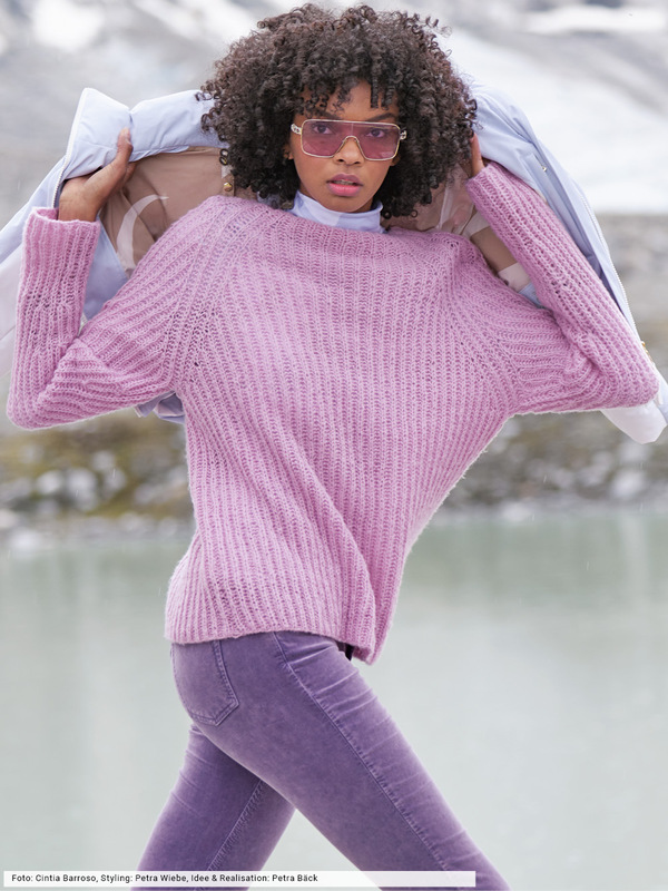 Ein Stück fürs Leben: Auch bei diesem schlichten Rippenpulli spielt die Raffinesse der Schnittführung eine bedeutende Rolle. Denn es wird an der Halsblende begonnen und danach in Runden und völlig ohne Nähte im Patentmuster weitergestrickt. Das flausche Softgarn aus Schur- und Baumwolle hat einen kleinen Kaschmir-Anteil und wird doppelt verstrickt – so geht die Arbeit noch schneller von der Nadel.