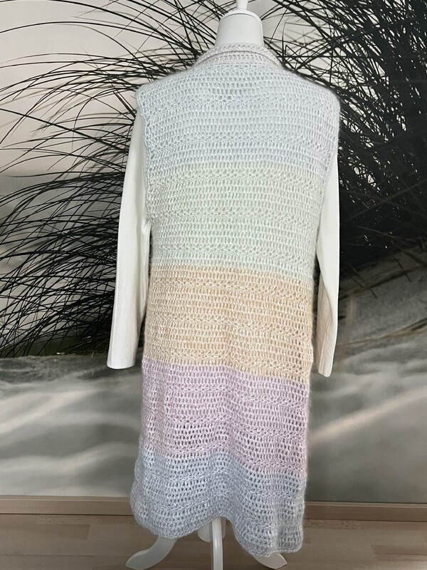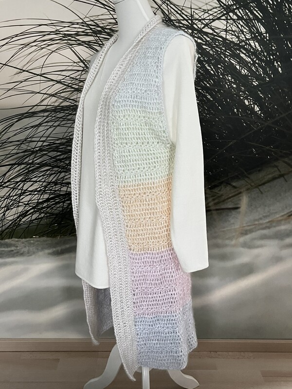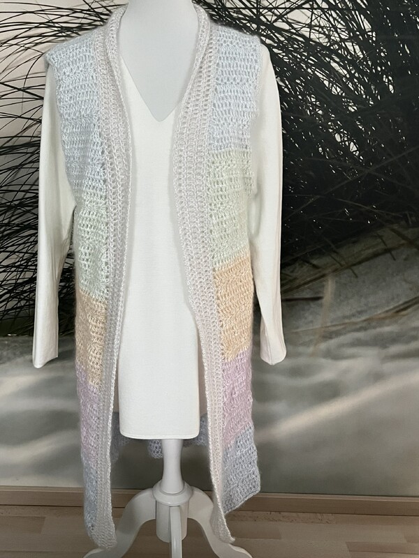 Lange, kuschlige Weste in Pastellfarben. Die Weste ist leicht und schnell nachzuarbeiten. Beschrieben wird Größe 36, die Größe ist leicht anpassbar.
