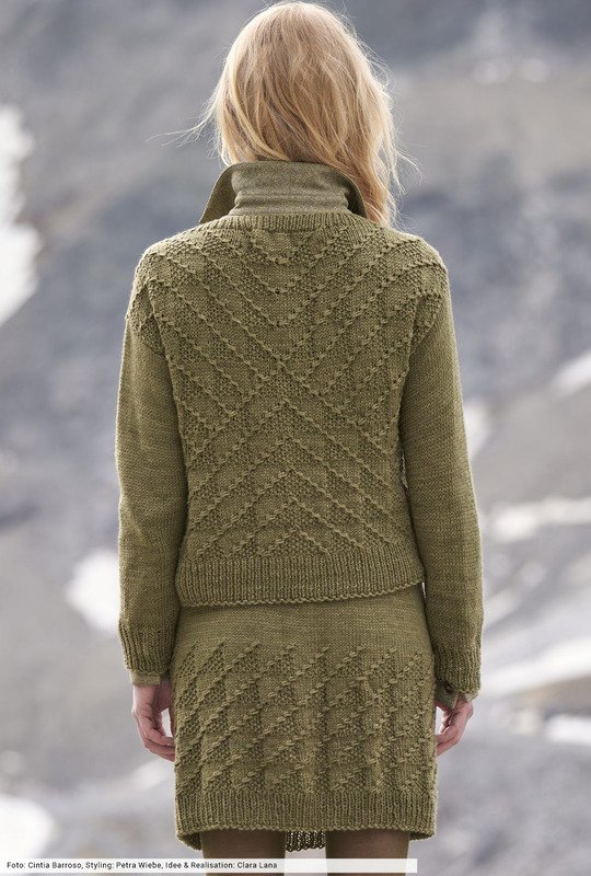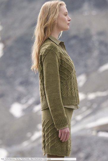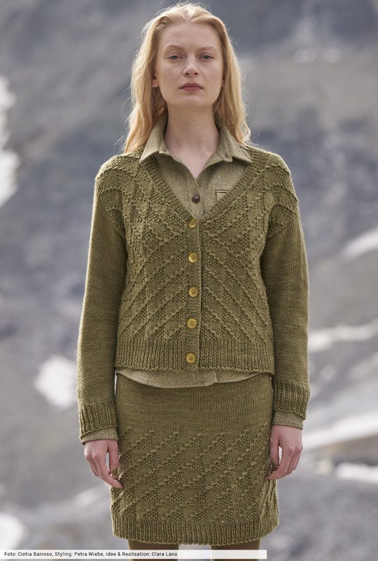 Dreamteam mit einem Hauch von Kaschmir: Dieses Luxusgarn gibt dem Cardigan den exquisiten Touch und ist der passende HIntergrund für die hellgrün changierenden Knöpfe. Außerdem lässt es das markente Dreieckmuster toll zur Geltung kommen, das sich an Rücken- und Vorderteilen in Szene setzt. Die Ärmel gehen dann in glatt rechts ganz souverän von der Nadel. Dazu der kurze Rock, bei dem sich die Strukturen als Passe in Szene setzen, und das herbstliche Duo ist perfekt.