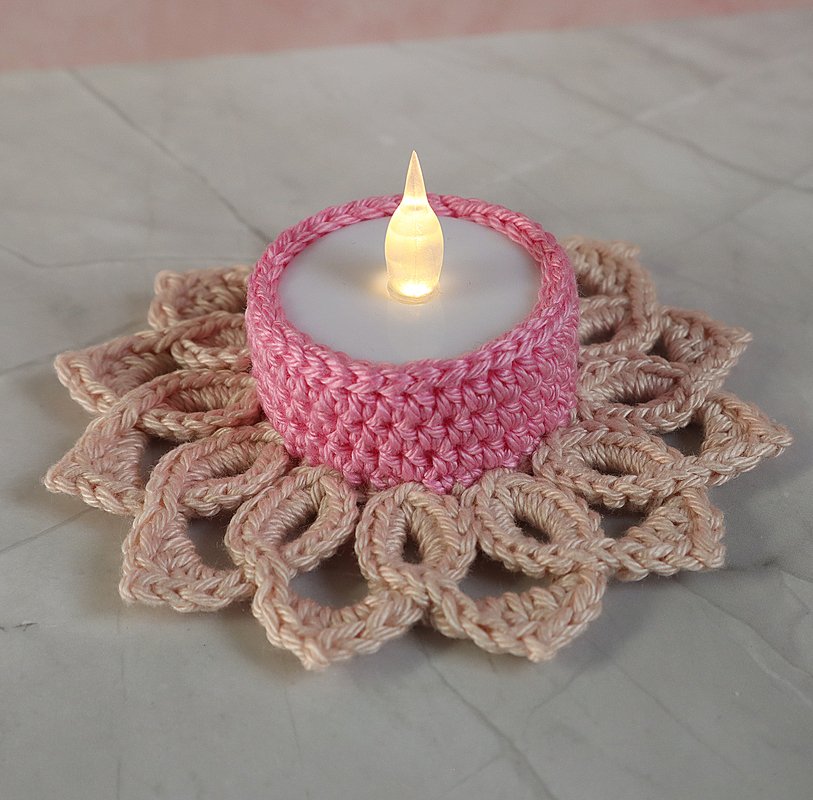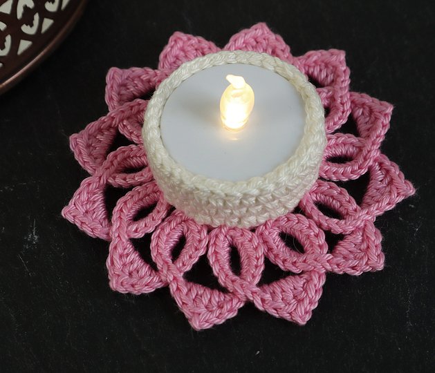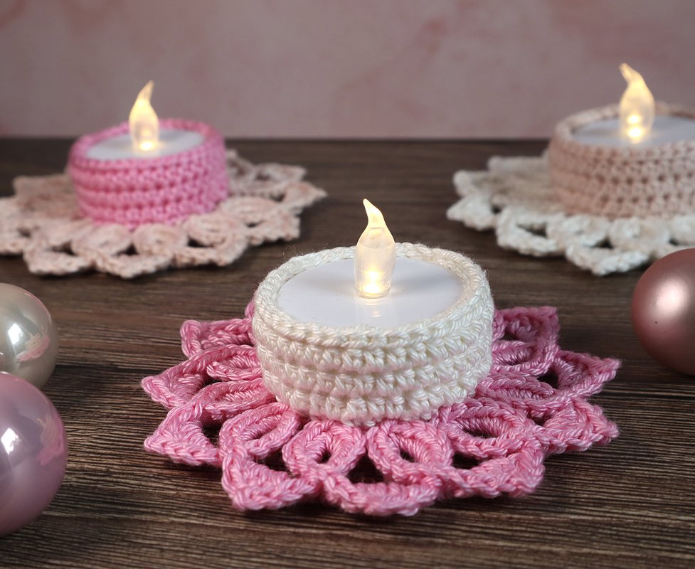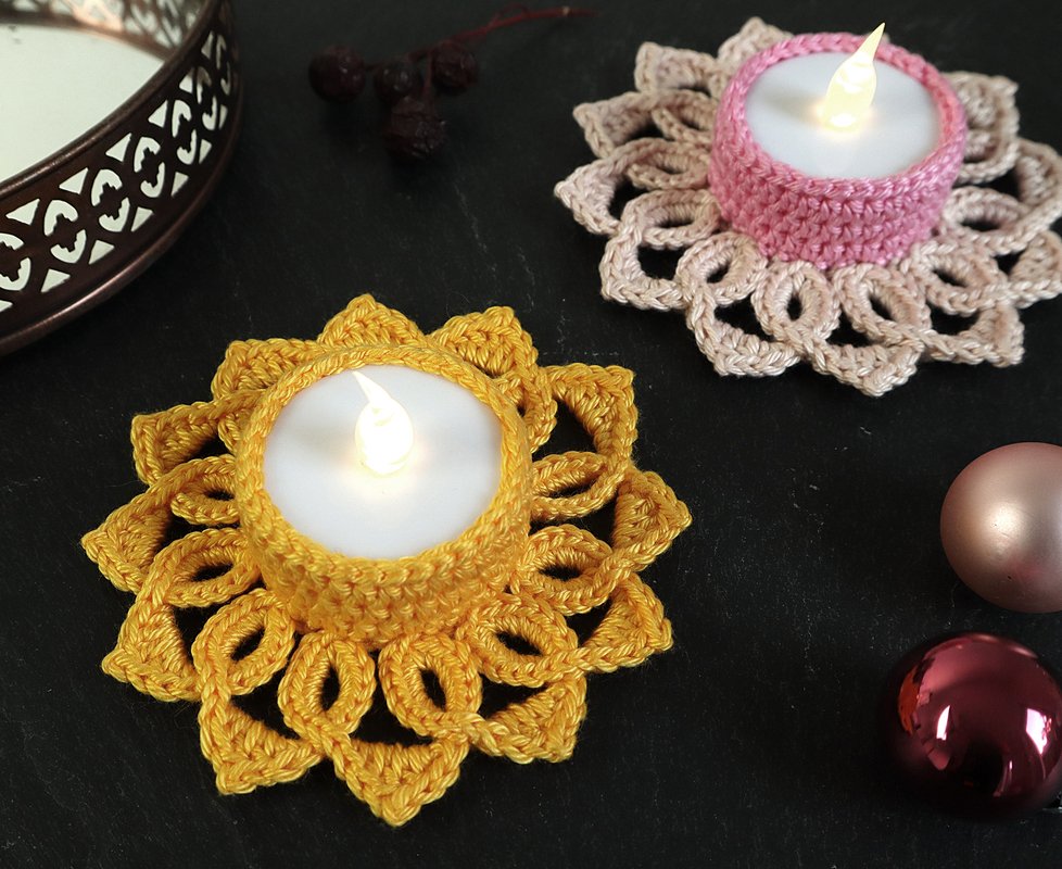 Der LED-Teelichthalter „Aurelia“ ist ein elegantes Häkelprojekt, mit dem du festliche Lichtakzente setzt – ob zu Weihnachten, zur Hochzeit oder als romantische Tischdeko.