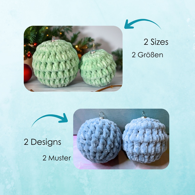 Die ausführliche Häkelanleitung umfasst 2 Kugeldurchmesser (6 cm oder 8 cm), durch einen verblüffenden Trick zwei Designs und spezifische Angaben für das Häkeln von einfarbigen und mehrfarbigen Kugeln.