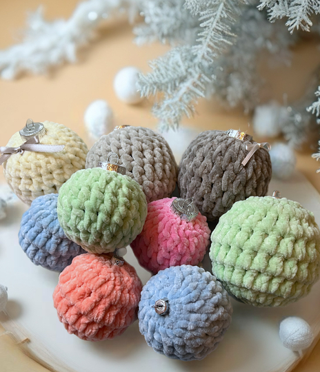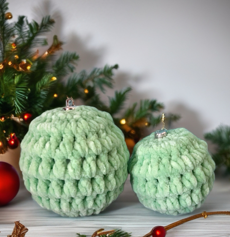 Die Kugeln sehen aus wie in Samt gehüllt und sehen einfach edel und festlich aus, ob man sie in bunten Farben oder minimalistisch in Naturtönen häkelt.