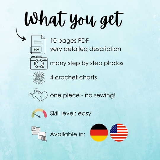 Die Anleitung wird als PDF-Datei zur Verfügung gestellt und umfasst 10 Seiten mit zahlreichen farbigen Abbildungen, die jeden Arbeitsschritt detailliert beschreiben und veranschaulichen. Es sind außerdem 4 Häkelschriften und Bezugsquellen für die Materialien enthalten.