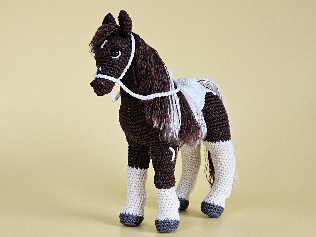 Pedro ist ein liebevoll gehäkeltes Amigurumi Pferd mit braun-weißem Fell, grauen Hufen, langer Mähne und Schweif. Mit Sattel und Zaumzeug trägt er euch direkt ins Märchenland.