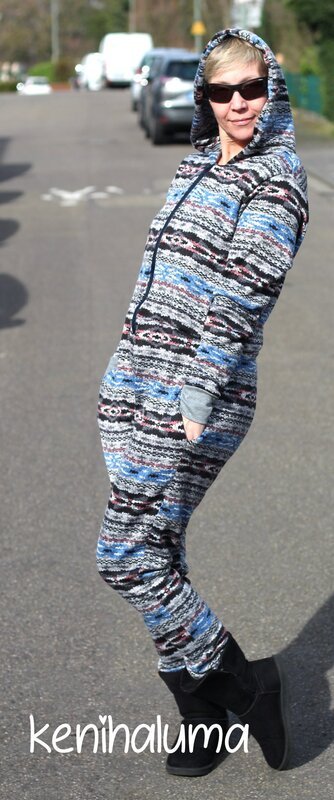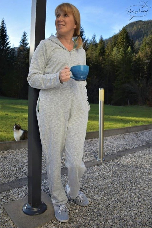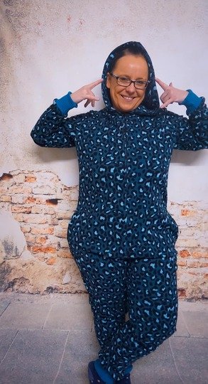 Und hier ist der Auftritt für Dörte. Im Stil eines Jumpsuits mit Kapuze, langem Reißverschluss und seitlichen Eingrifftaschen ist es quasi schon ein Must - Have für gemütliche Tage bei Tee und Keksen.