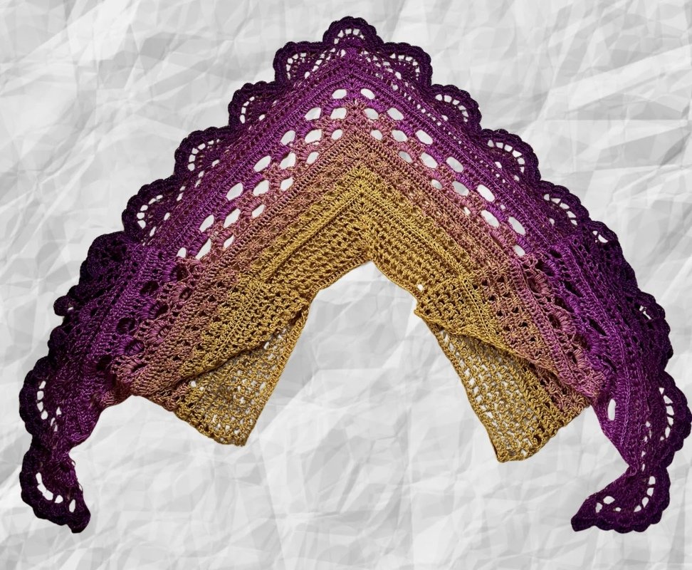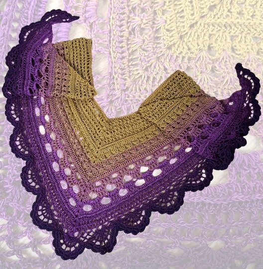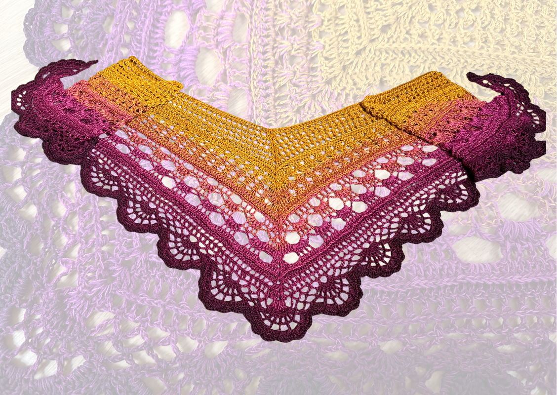Mein Beispielschal, gehäkelt mit einem Bobbel 750m/3-fädig und NS 3,5, hat eine Spannweite von ca. 1,80m und eine Tiefe von 0,40m erreicht.