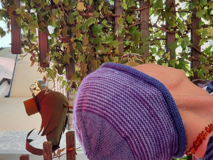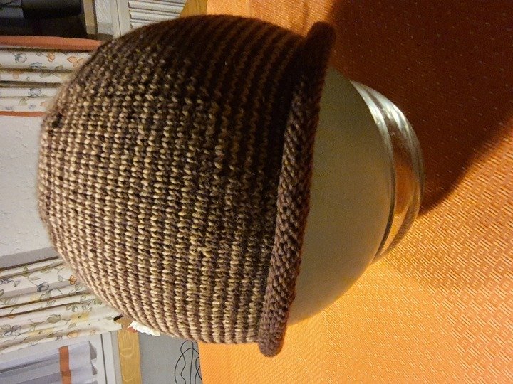 Die Mütze wird in Spiralen mit 2 Farben gestrickt.