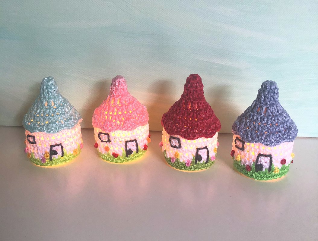 Häkelanleitung für ein kleines Haus, Miniaturhaus, mit oder ohne Lichtfunktion, passgenau für LED-Teelichter entworfen.