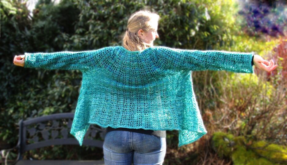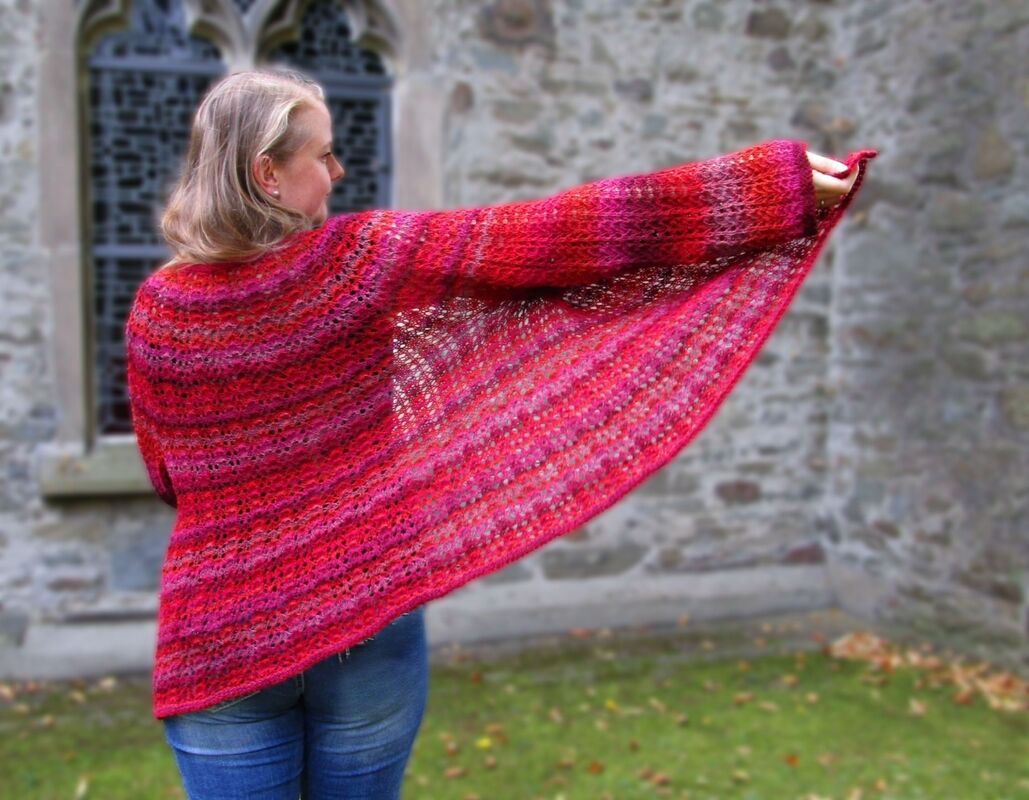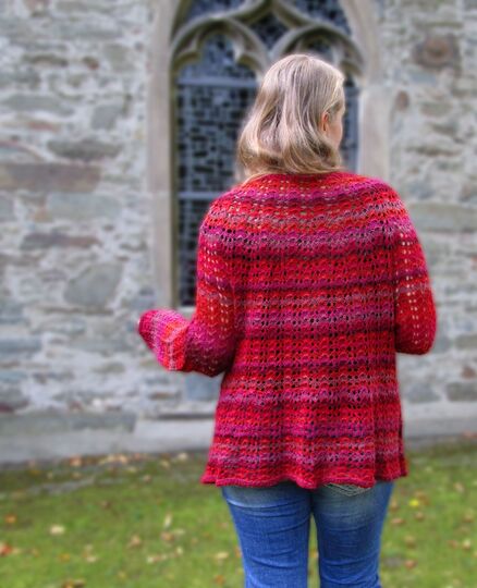 Columbine ist eine Anleitung für eine Lochmuster Weste oder Jacke und enthält genaue Angaben für 5 verschiedene Doppelgrößen, Größe 40 bis 58, und zwei verschiedene Garnstärken.