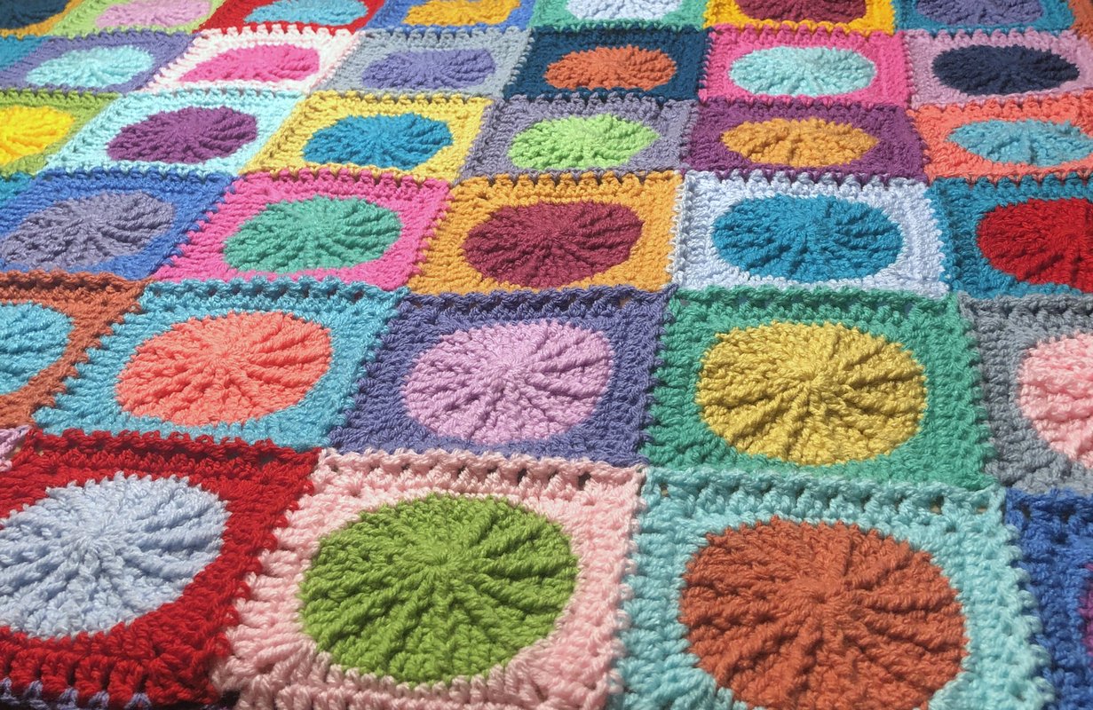 Granny-Square-Decke UMBRELLA verdankt ihren Namen den runden Kreisen inmitten der Quadrate, die aussehen wie kleine Cocktail-Schirmchen von oben betrachtet. :-)