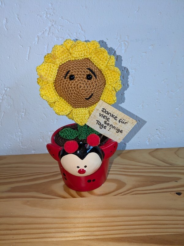 Diese Sonnenblume ist ein perfektes Geschenk, um jemandem eine kleine Freude zu machen. Sie braucht kein Wasser und macht einfach nur gute Laune. Wer möchte, kann noch einen kleinen personalisierten Spruch anbringen. Das wertet das Ganze dann noch zusätzlich auf.