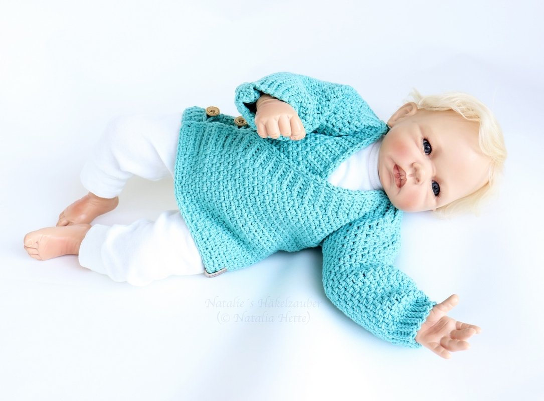 Damit können Sie schnell eine schöne Wickeljacke und dazu passende Hose in der Größe 50-92, bzw. 50-116 für Ihr Kind (Enkelkind) häkeln. Diese Jacke und Hose können sowohl für den Winter als auch für den Sommer gehäkelt werden, abhängig von der Wolle!