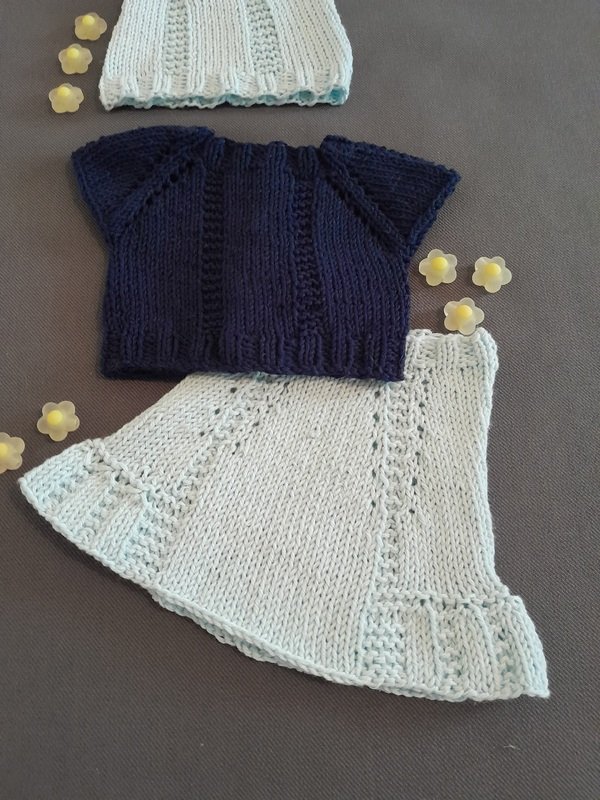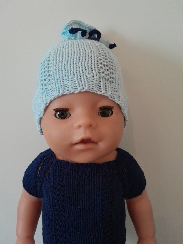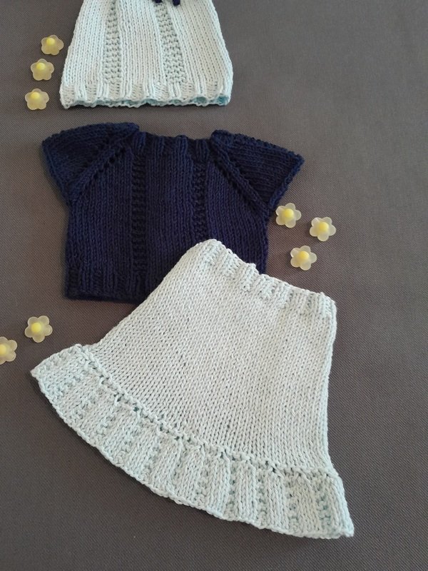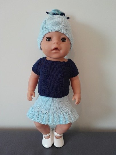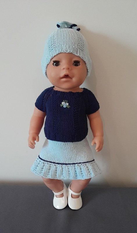 Strickanleitung für 3 teiliges Set „Olivia“ für Puppengröße 42 – 44 cm.