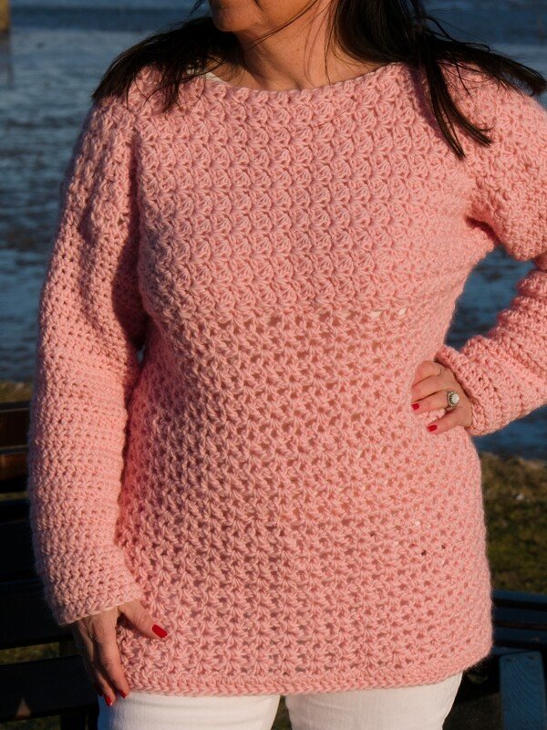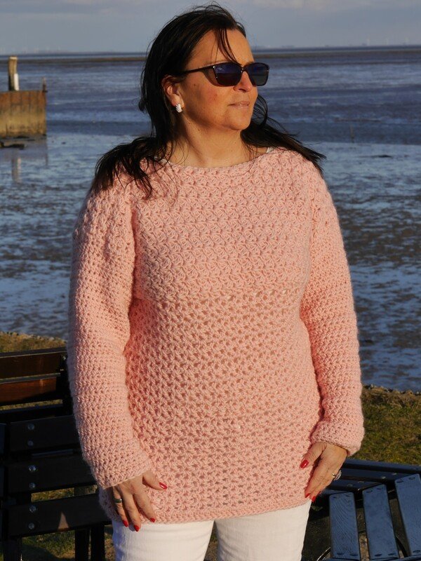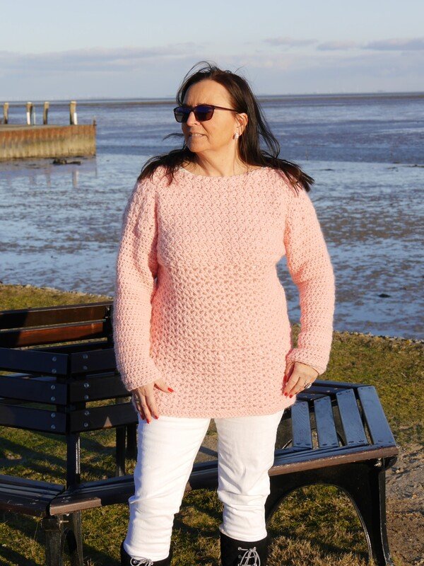 Der Pullover kann von Kindergröße bis zu jeder Erwachsenengröße gehäkelt werden und ist aufgrund des Musters und Schnittes auch ein schicker Herrenpulli.