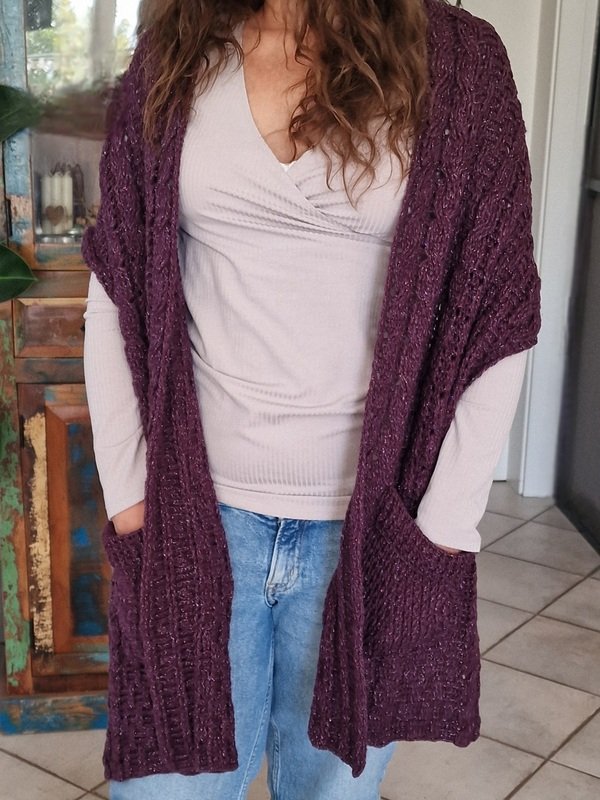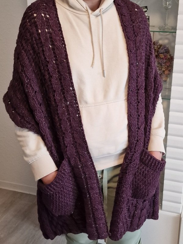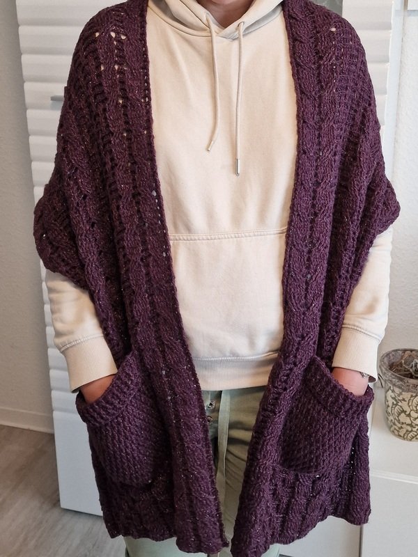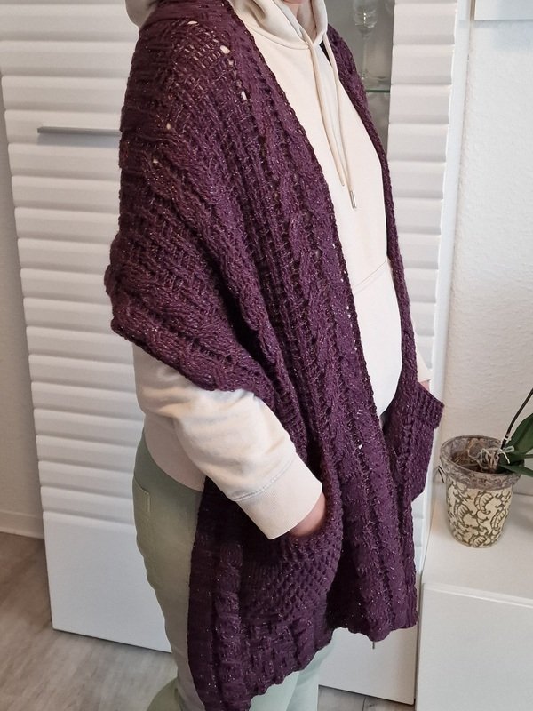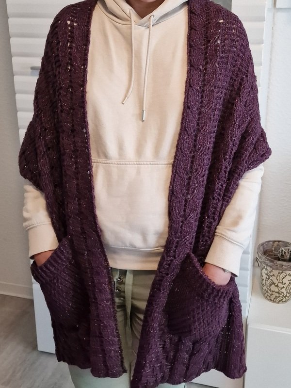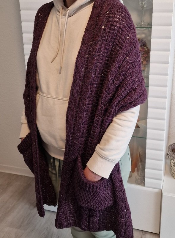 Das Schalmuster besteht aus Zöpfen, die sich mit einem Relief – Strukturmuster abwechseln. Das Muster der Taschen besteht aus festen Maschen, Stäbchen und tiefer gestochenen Reliefstäbchen.