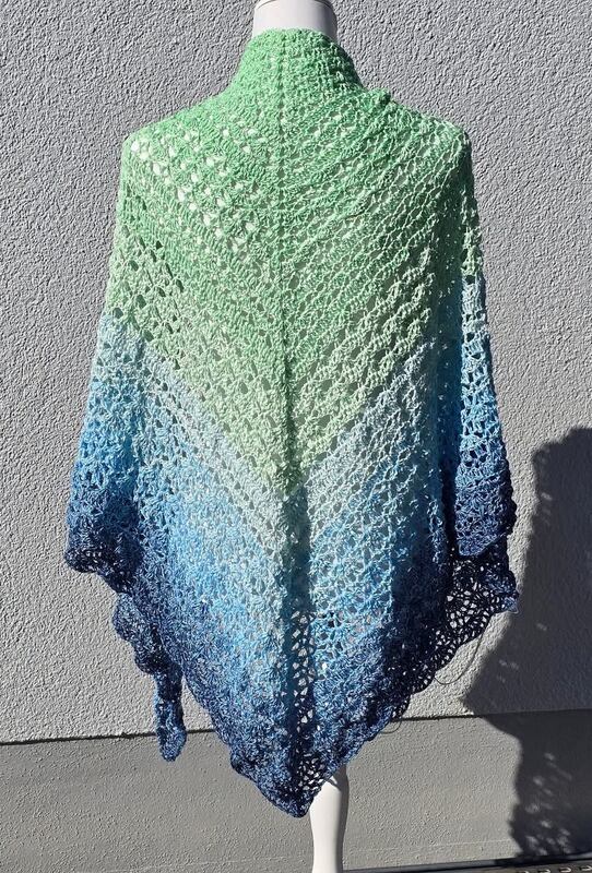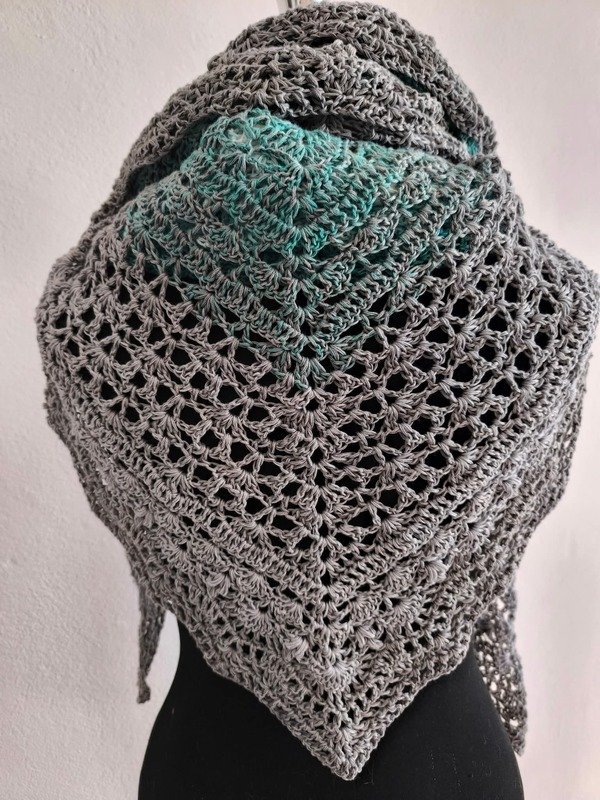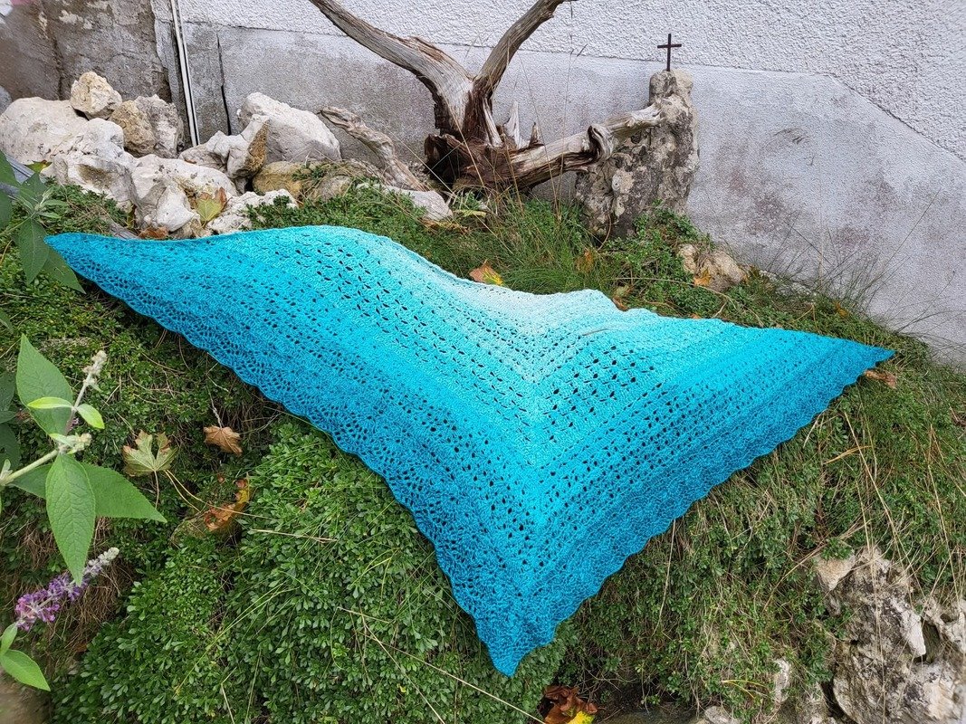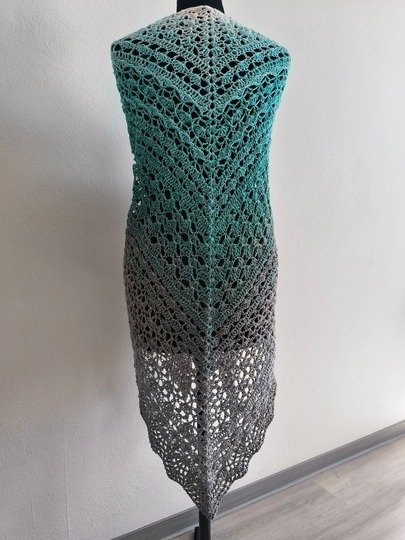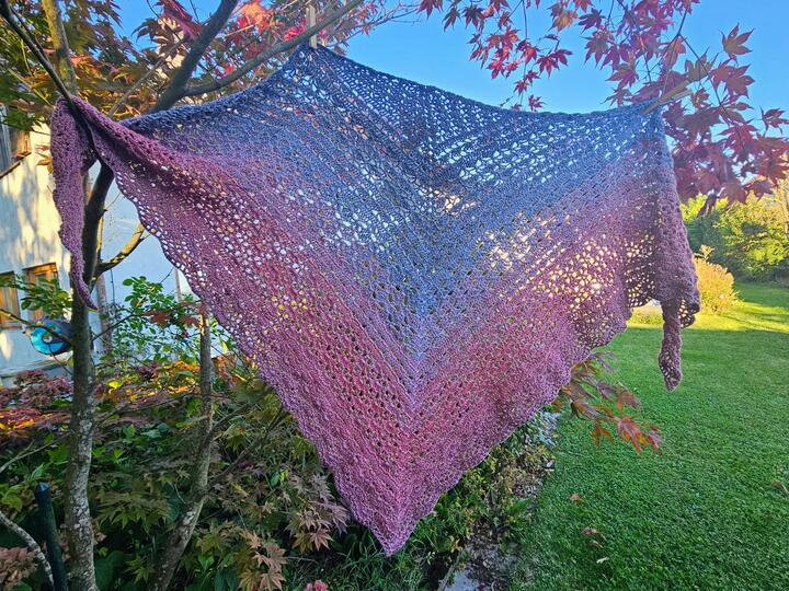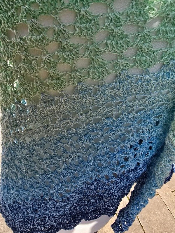 Es kann mit jedem gewünschten Garn gehäkelt werden, ich würde dazu einen Farbverlaufsbobbel mit 1000 m Lauflänge empfehlen. Mein Tuch ist aus einer Wunschwicklung von Kandelas Handarbeitsbox.