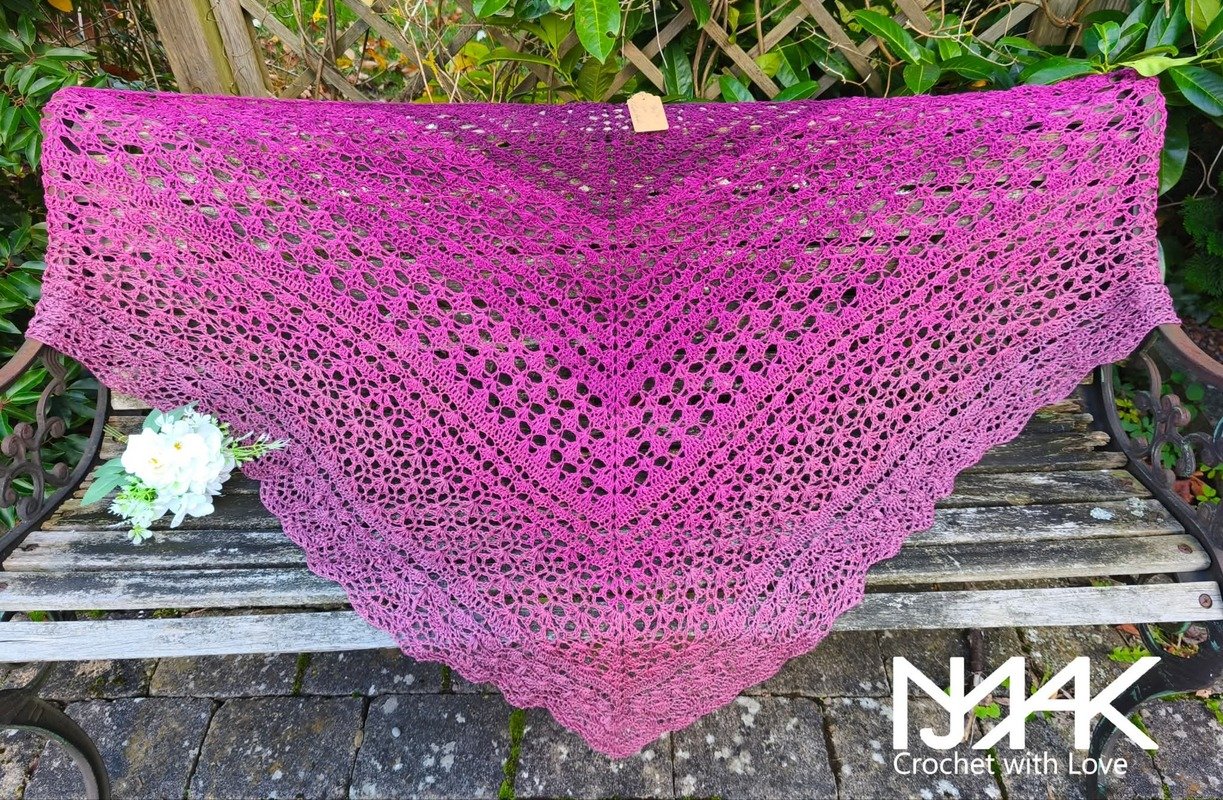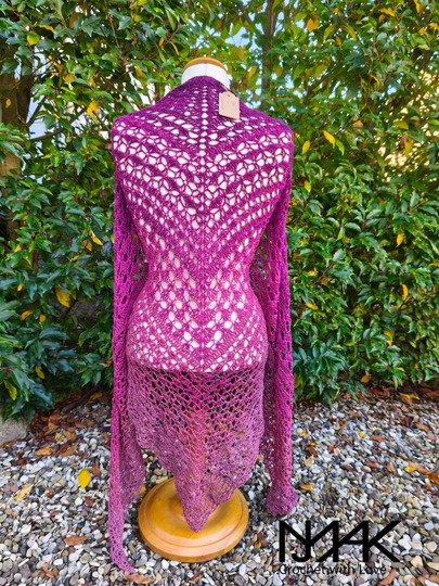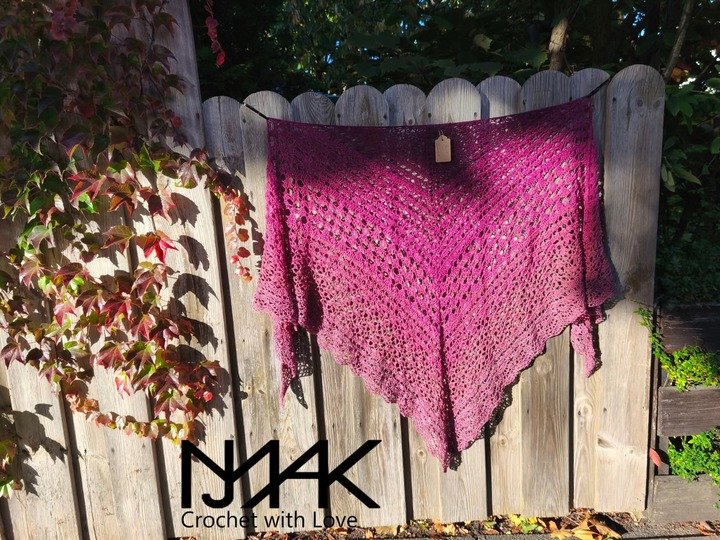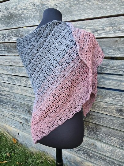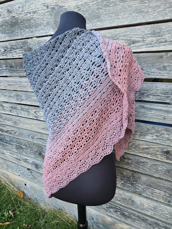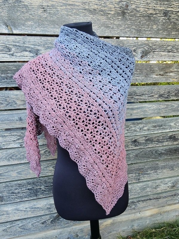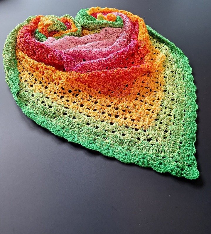 Es kann mit jedem gewünschten Garn gehäkelt werden, ich würde dazu einen Farbverlaufsbobbel mit 1000 m Lauflänge empfehlen. Mein Tuch ist aus einer Wunschwicklung von Kandelas Handarbeitsbox.