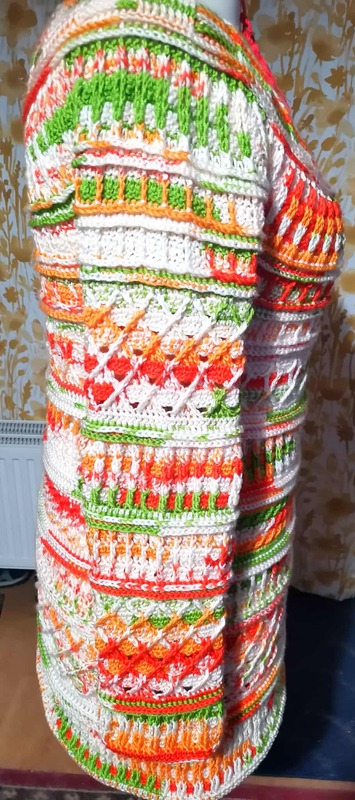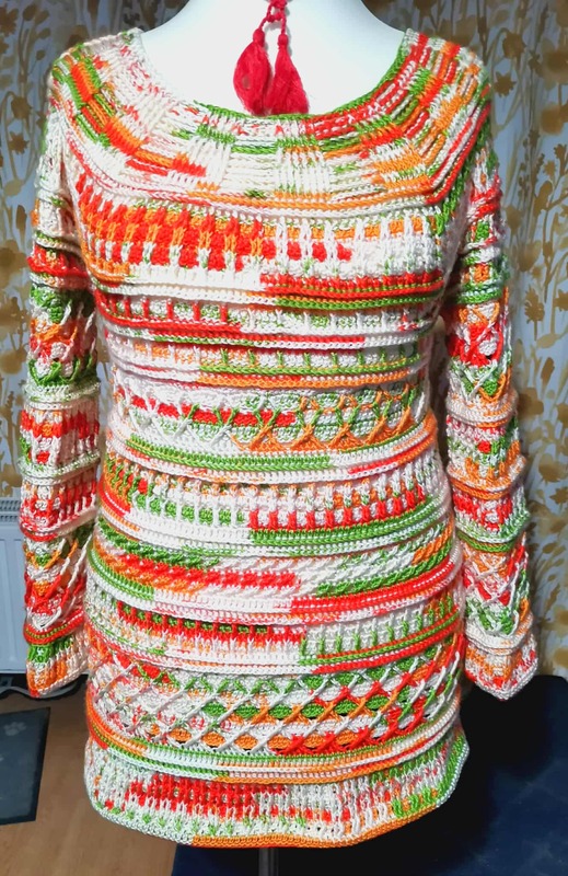 Er wird in einem Stück mit Rundpasse von oben nach unten gearbeitet, die Ärmel werden direkt angehäkelt und er kann ganz mühelos an alle Größen und Längen angepasst werden.
