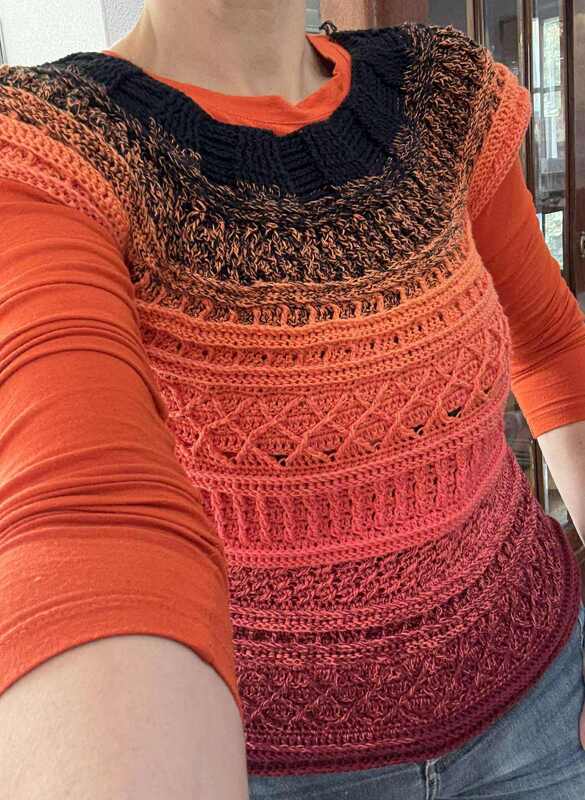 Egal, ob einfarbig oder bunt gehäkelt, ob als Pulli, als Pullunder über Bluse oder langärmeliges Shirt oder alleine als Shirt getragen, er ist immer ein wahrer Blickfang.
