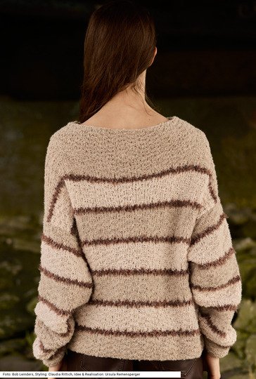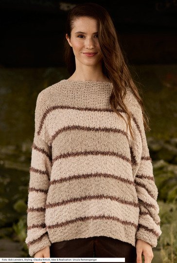 Kuschelig, modern und einfach zu stricken, dabei prägen ein Bouclégarn und ein Garn in Fell-Optik diesen Pulli mit ihrer auffälligen Struktur. Die harmonisch aufeinander abgestimmten Farbstreifen und ein gemütlicher Stehkragen, der durch den weiten, runden Halsausschnitt breit auseinandergezogen ist, sorgen für ein lässiges Outfit. Das eine Garn setzt sich aus Polyacryl, Polyamid, Seide, Wolle und Viskose zusammen, das andere aus Polyacryl, Alpaka, Wolle und Polyester. Gestrickt werden ein Schachbrettmuster aus rechten und linken Maschen und glatt rechts in drei Farben. Die Anleitung gibts für die Größen 38/40, 42/44 und 46/48.