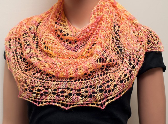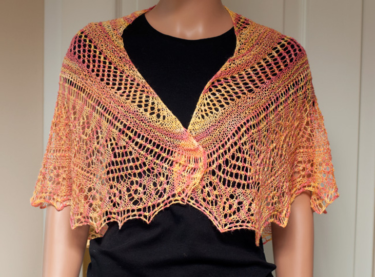 Strickanleitung für ein luftiges, halbrundes Schulter- bzw. Halstuch. Benötigt wird ca 600 m feines Lacegarn. Gestrickt wird im Ajourmuster (Lace), man beginnt mit der Spitzenbordüre und nimmt daraus anschließend die Maschen für die Tuchmitte auf. Alle Angaben für das Tuch beruhen auf einer Endgröße von 170 x 30 cm - eine Anpassung der Größe ist jedoch einfach möglich.