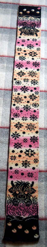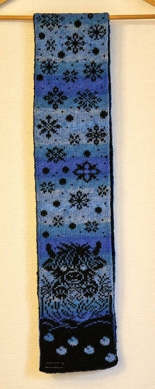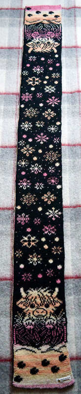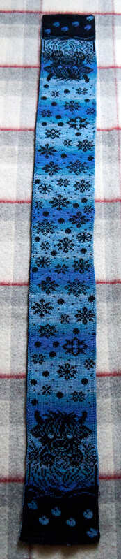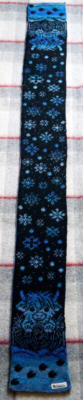 Mit einer 3mm-Rundstricknadel verstrickte ich ein Garn, das eine Maschenprobe auf 10 x 10 cm von 28 Maschen x 39 Reihen ergibt. Mit diesem wurde der Schal etwa 14,8 cm breit und 144 cm lang.
