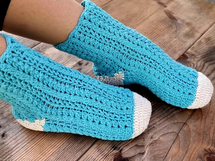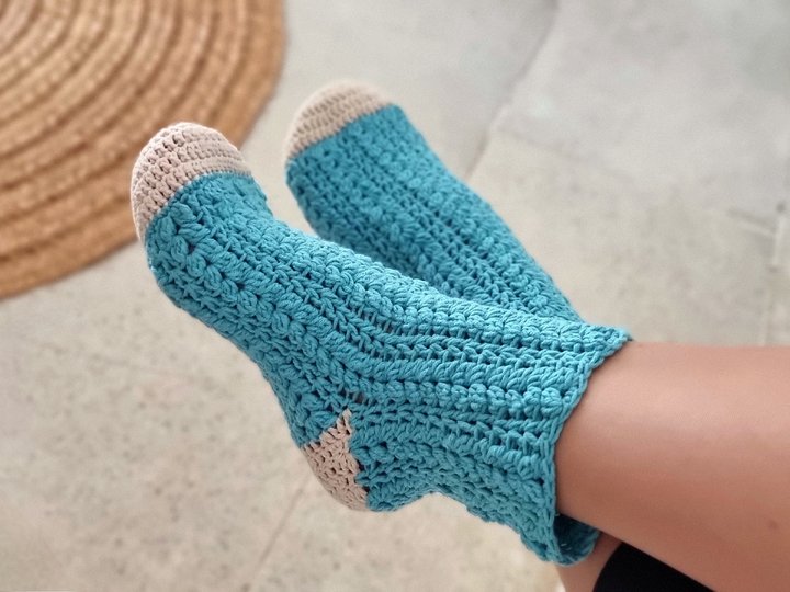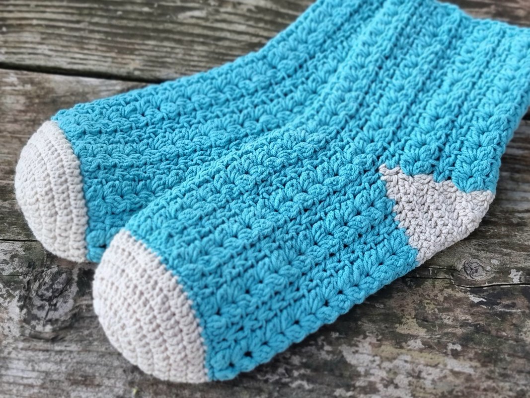 Die Anleitung enthält eine Beschreibung, wie die Größe der Socken angepasst werden kann. Sie können Socken in der gewünschten Größe häkeln.