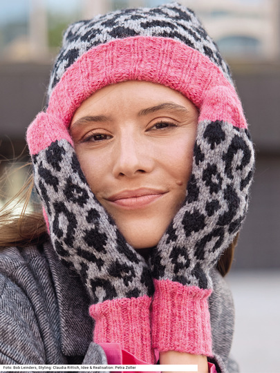 Dieses Set mit Leopardenmuster sorgt für Spannung im Look. Mütze und Fausthandschuhe bestechen durch ihr kraftvolles Jacquardmuster als Animalprint, während an den Bündchen und den Spitzen am Daumen und der Hand eine kontrastierende Farbe verarbeitet wird. Die Handschuh- und Mützenbündchen werden im 2/2-Rippenmuster gestrickt, das Jacquardmuster klassisch glatt rechts. Eine Anleitung für ein Garn aus Schurwolle, Alpaka und Polyamid gibts für die Mützen mit 54 – 56 und 57 – 59 cm Kopfumfang und die Handschuhe in Größe 6 – 7.